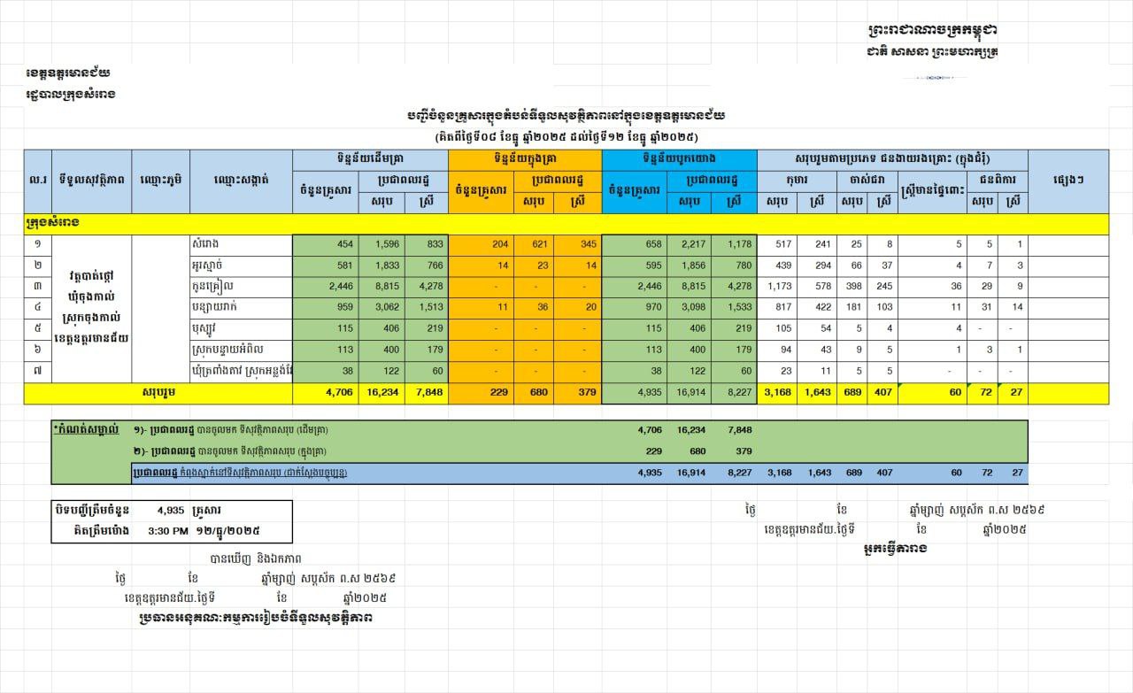 សូមជម្រាបផងដែរថា តាមប្រភពរដ្ឋបាលក្រុងសំរោង គិតចាប់ពីថ្ងៃទី ៨ មកដល់ ត្រឹមម៉ោង ៣ ថ្ងៃត្រង់ថ្ងៃទី ១២ ខែធ្នូ ឆ្នាំ ២០២៥ នេះ ជនភៀសសឹកមានចំនួនសរុប ៤៩៣៥ គ្រួសារហើយ ដែលមកពីសង្កាត់សំរោង អូរស្មាច់ កូនគ្រៀល បន្សាយរាក់ បុស្បូវ បន្ទាយអំពិល និងអន្លង់វែង ៕