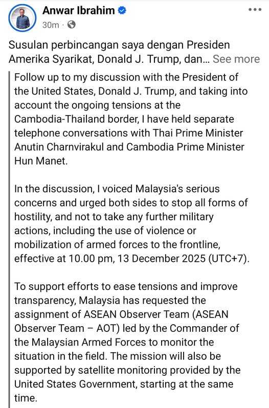 នៅក្នុងកិច្ចសន្ទនាទាំងនេះ ខ្ញុំបានសម្តែងនូវការព្រួយបារម្ភយ៉ាងជ្រាលជ្រៅរបស់ប្រទេសម៉ាឡេស៊ី ចំពោះស្ថានភាពនេះ និងបានអំពាវនាវដល់ភាគីទាំងពីរ ឱ្យប្រកាន់យកនូវការអត់ធ្មត់ខ្ពស់បំផុត បញ្ឈប់រាល់ទម្រង់នៃអរិភាព និងចៀសវាងរាល់សកម្មភាពយោធាបន្ថែមទៀត រួមទាំងការប្រើប្រាស់កម្លាំង ឬការចល័តទ័ពទៅមុខ ដោយចាប់ផ្តើមអនុវត្តចាប់ពីថ្ងៃទី ១៣ ខែធ្នូ ឆ្នាំ២០២៥ វេលាម៉ោង ២២:០០ (UTC+7) ។