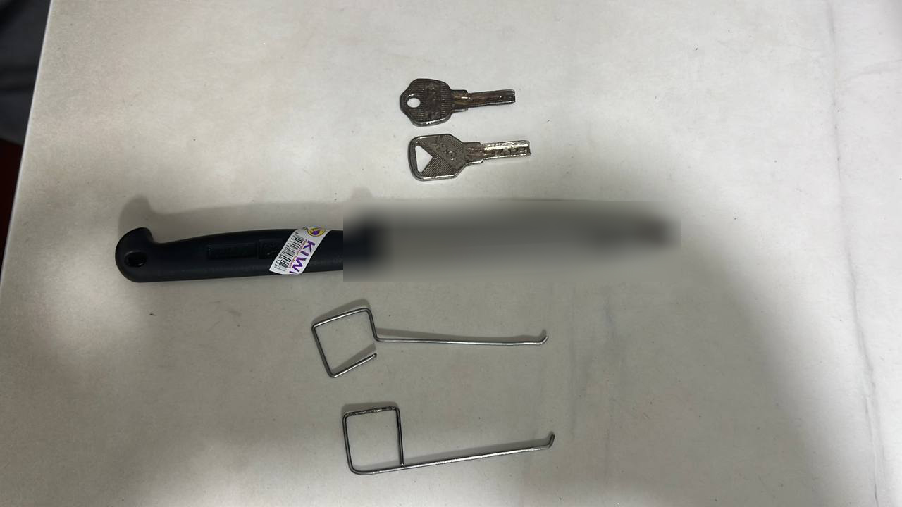 រាជធានីភ្នំពេញ ៖ នគរបាលប៉ុស្តិ៍ចោមចៅទី៣ ខណៈល្បាតនៅក្នុងមូលដ្ឋានហើយឃើញជនម្នាក់កំពុងដើរគួរឲ្យសង្ស័យ ក៏បានហៅឲ្យឈប់ដើម្បីឆែកឆេរ ស្រាប់តែឃើញមានដែកសរសៃលួសកែច្នៃសម្រាប់ឆ្កឹះមេសោចំនួន២ និង កូនសោចំនួន២ កាំបិតចុងស្រួច១ ។
