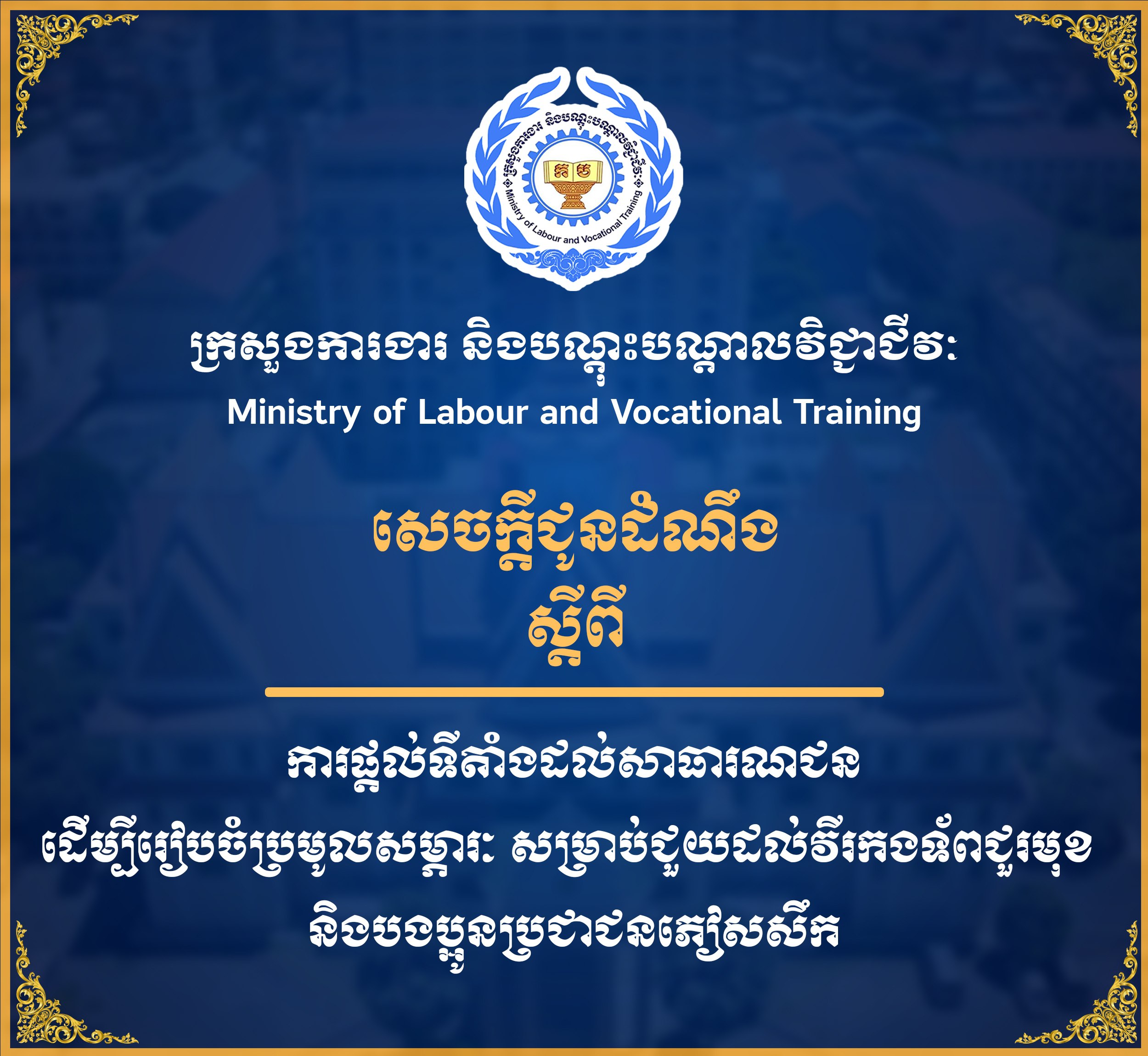 រាជធានីភ្នំពេញ ៖ ក្រសួងការងារ និងបណ្តុះបណ្តាលវិជ្ជាជីវៈ នៅថ្ងៃទី ១៤ ខែធ្នូ ឆ្នាំ ២០២៥ នេះ បានជូនដំណឹងពីការផ្តល់ទីតាំងចំនួន ២កន្លែងជូនដល់សាធារណជន ជាពិសេស យុជន ដែលកំពុងស្វែងរកទីតាំងសម្រាប់រៀបចំប្រមូលសម្ភារ ដើម្បីទទួលជំនួយសប្បុរសធម៌សម្រាប់គាំទ្រដល់វីរកងទ័ពជួរមុខ និងបងប្អូនប្រជាជនភៀសសឹកដែលរងគ្រោះ ដោយសារសង្គ្រាមឈ្លានពានដ៏ឃោរឃៅពីសំណាក់យោធាថៃ ។