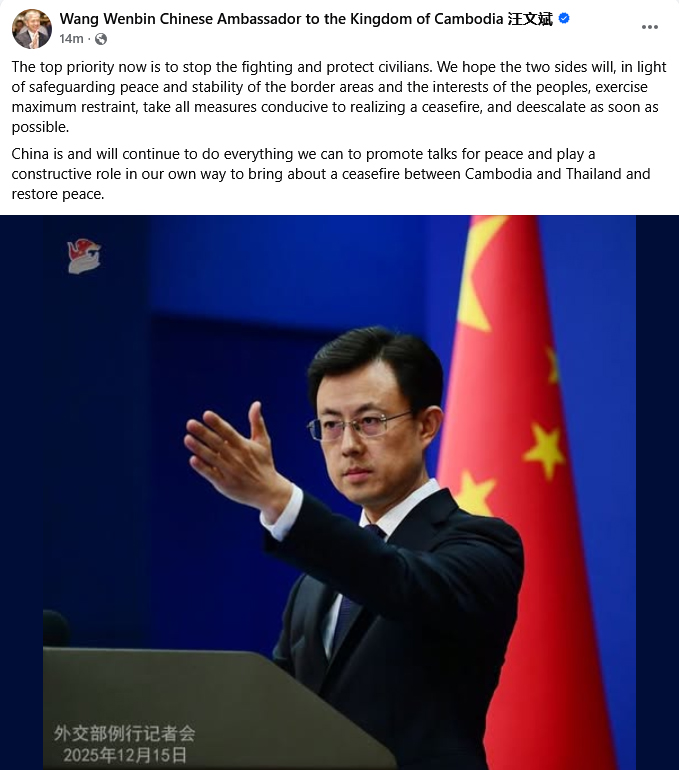 រាជធានីភ្នំពេញ ៖ លោក វ៉ាង វិនពីន (Wang Wenbin) ឯកអគ្គរដ្ឋទូតចិន ប្រចាំនៅកម្ពុជា បានបង្ហោះសារនៅលើទំព័រហ្វេសប៊ុកនៅយប់ថ្ងៃទី១៥ ធ្នូនេះថា ៖ អាទិភាពចម្បងនៅពេលនេះ គឺការបញ្ឈប់ការប្រយុទ្ធគ្នា និងការពារជនស៊ីវិល។ ប្រទេសចិនសង្ឃឹមថា ភាគីទាំងពីរ នឹងអនុវត្តការអត់ធ្មត់ជាអតិបរមា ដោយពិចារណាលើការការពារសន្តិភាព និងស្ថិរភាពនៃតំបន់ព្រំដែន និងផលប្រយោជន៍របស់ប្រជាជន ចាត់វិធានការទាំងអស់ដែលអំណោយផលដល់ការសម្រេចបាននូវបទឈប់បាញ់ និងបន្ធូរបន្ថយភាពតានតឹងឱ្យបានឆាប់តាមដែលអាចធ្វើទៅបាន ។