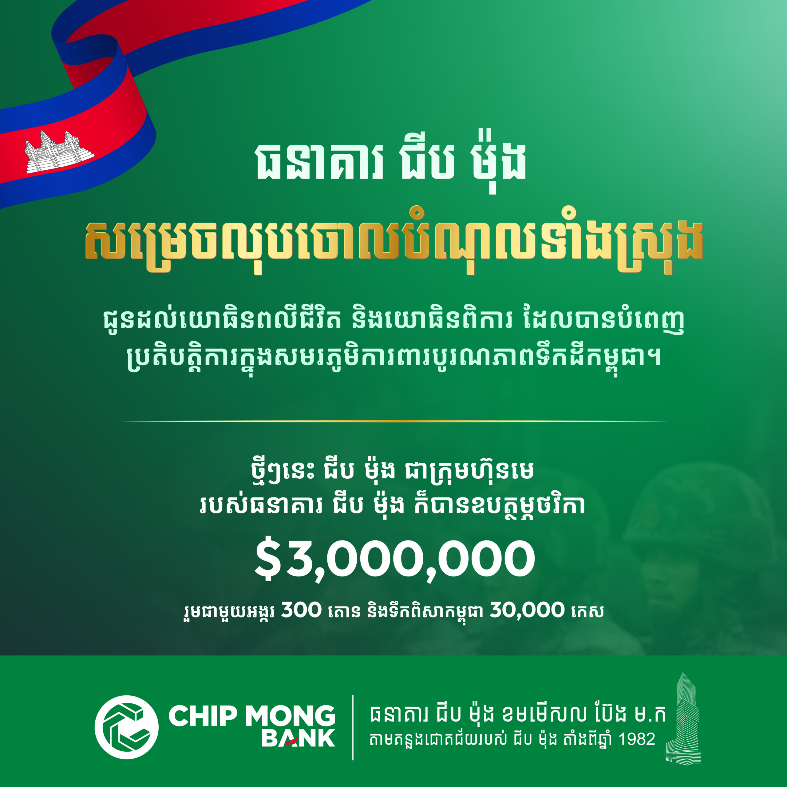 គួរបញ្ជាក់ផងដែរថា នាពេលថ្មីៗនេះ ជីប ម៉ុង ដែលជាក្រុមហ៊ុនមេ ធនាគារ ជីប ម៉ុង ក៏បានឧបត្ថម្ភជាថវិកា 3,000,000 ដុល្លារអាមេរិក រួមទាំងអង្ករ 300តោន និង ទឹកពិសាកម្ពុជា 1.5លីត្រ 30,000កេស ជួយដល់កងទ័ពជួរមុខកម្ពុជា ដែលឈរជើងនៅបណ្តោយព្រំដែនកម្ពុជា-ថៃ និងជនភៀសសឹក ។
