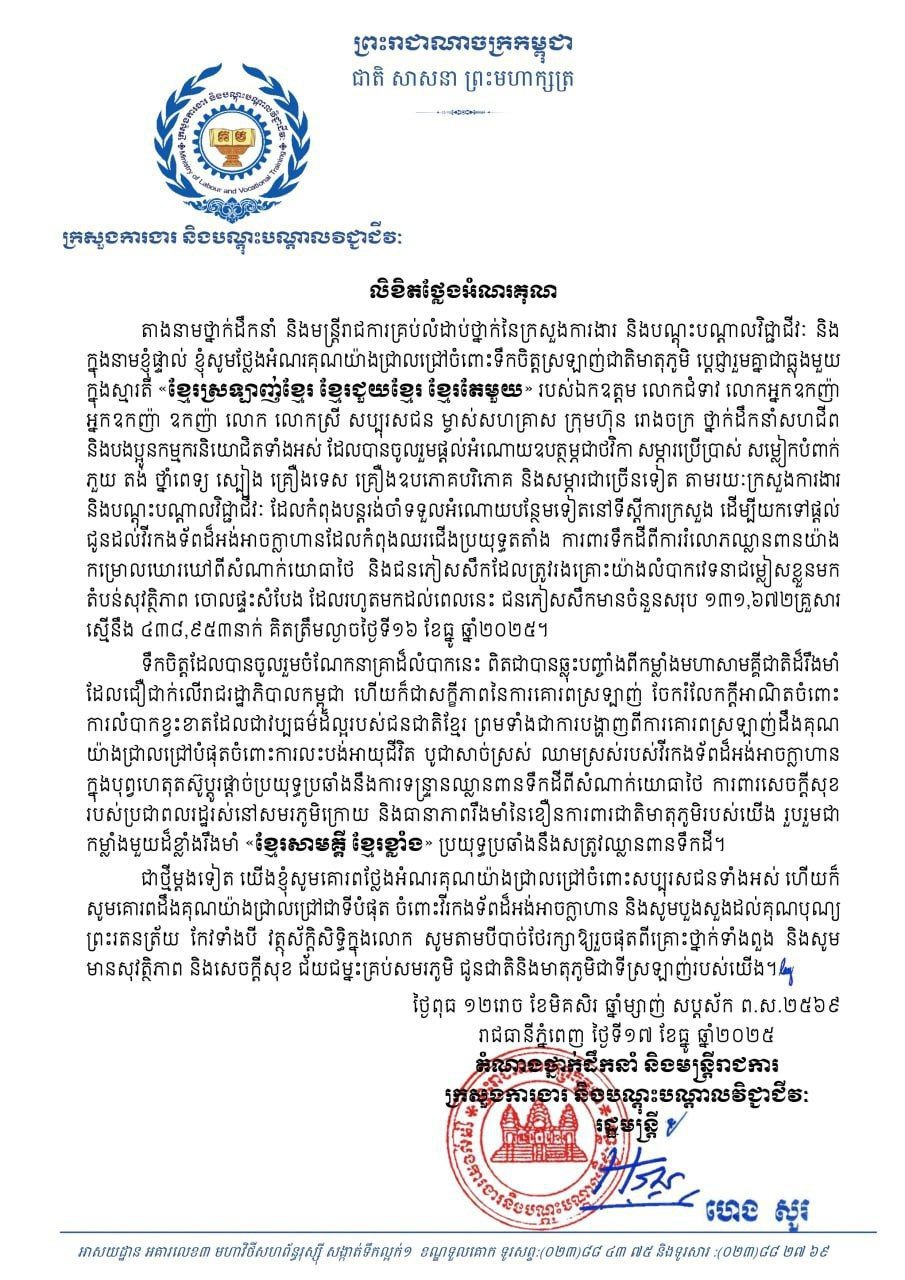 យោងតាមលិខិតថ្លែងអំណរគុណរបស់ក្រសួងការងារ នៅថ្ងៃទី១៧ ខែធ្នូនេះ ដែលចុះហត្ថលេខា ដោយឯកឧត្ដមរដ្ឋមន្ត្រី ហេង សួរ បានសរសេរថា តាងនាមថ្នាក់ដឹកនាំ និងមន្ត្រីរាជការគ្រប់លំដាប់ថ្នាក់ នៃក្រសួងការងារ និងបណ្តុះបណ្តាលវិជ្ជាជីវៈ និងក្នុងនាមឯកឧត្ដមផ្ទាល់ សូមថ្លែងអំណរគុណយ៉ាងជ្រាលជ្រៅ ចំពោះទឹកចិត្តស្រឡាញ់ជាតិមាតុភូមិ ប្តេជ្ញារួមគ្នាជាធ្លុងមួយក្នុងស្មារតី «ខ្មែរស្រឡាញ់ខ្មែរ ខ្មែរជួយខ្មែរ ខ្មែរតែមួយ» របស់ឯកឧត្តម លោកជំទាវ លោកអ្នកឧកញ៉ា អ្នកឧកញ៉ា ឧកញ៉ា លោក លោកស្រី សប្បុរសជន ម្ចាស់សហគ្រាស ក្រុមហ៊ុន រោងចក្រ ថ្នាក់ដឹកនាំសហជីព និងបងប្អូនកម្មករនិយោជិតទាំងអស់ ដែលបានចូលរួមផ្តល់អំណោយឧបត្ថម្ភជាថវិកា សម្ភារប្រើប្រាស់ សម្លៀកបំពាក់ ភួយ តង់ ថ្នាំពេទ្យ ស្បៀង គ្រឿងទេស គ្រឿងឧបភោគបរិភោគ និងសម្ភារជាច្រើនទៀត តាមរយៈក្រសួងការងារ និងបណ្តុះបណ្តាលវិជ្ជាជីវៈ ដែលកំពុងបន្តរង់ចាំទទួលអំណោយបន្ថែមទៀតនៅទីស្តីការក្រសួង ដើម្បីយកទៅផ្តល់ជូនដល់វីរកងទ័ព ដ៏អង់អាចក្លាហាន ដែលកំពុងឈរជើងប្រយុទ្ធតតាំងការពារទឹកដី ពីការរំលោភឈ្លានពានយ៉ាងកម្រោលឃោរឃៅ ពីសំណាក់យោធាថៃ និងជនភៀសសឹក ដែលត្រូវរងគ្រោះយ៉ាងលំបាកវេទនាជម្លៀសខ្លួន មកតំបន់សុវត្ថិភាព ចោលផ្ទះសំបែង ដែលរហូតមកដល់ពេលនេះ ជនភៀសសឹកមានចំនួនសរុប ១៣១,៦៧២គ្រួសារ ស្មើនឹង ៤៣៨,៩៥៣នាក់ គិតត្រឹមល្ងាចថ្ងៃទី១៦ ខែធ្នូ ឆ្នាំ២០២៥ ។