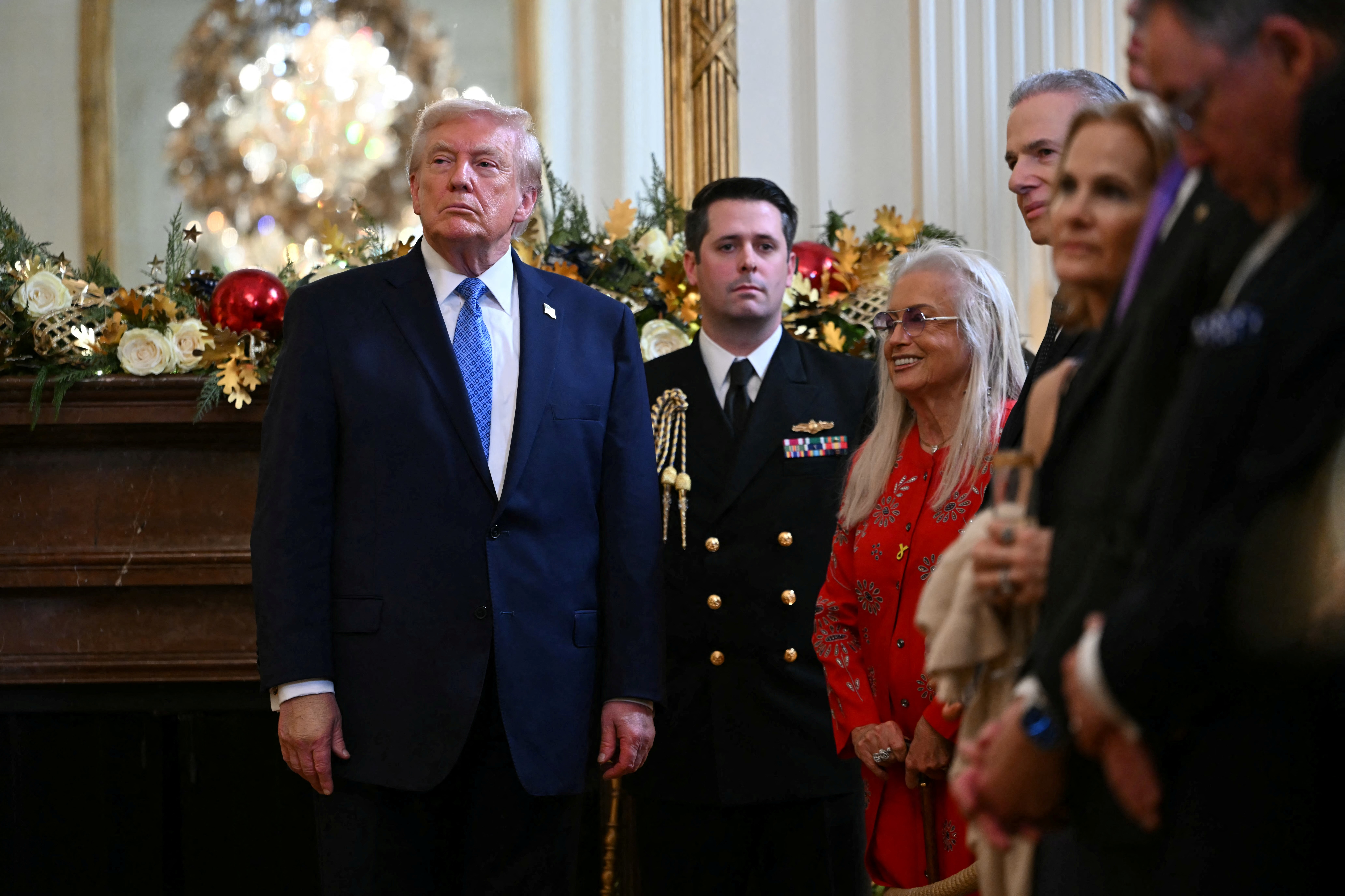 US President Donald Trump stands next to Israeli-US physician and businesswoman Miriam Adelson and other guests at a Hanukkah reception in the East Room of the White House in Washington, DC, on December 16, 2025. (Photo by ANDREW CABALLERO-REYNOLDS / AFP) ពាក្យបណ្តឹងនោះ ត្រូវបានដាក់នៅតុលាការសហព័ន្ធមួយនាទីក្រុងម៉ៃអាមី ដោយប្រធានាធិបតីដែលទាមទារសំណងយ៉ាងតិច៥ពាន់លានដុល្លារ សម្រាប់បទចោទមួយក្នុងចំណោមបទចោទប្រកាន់២ គឺបទចោទប្រកាន់បរិហារកេរ និងរំលោភបំពានច្បាប់រដ្ឋផ្លរីដា ស្ដីពីការធ្វើពាណិជ្ជកម្មដោយបោកប្រាស់និងមិនស្មោះត្រង់។