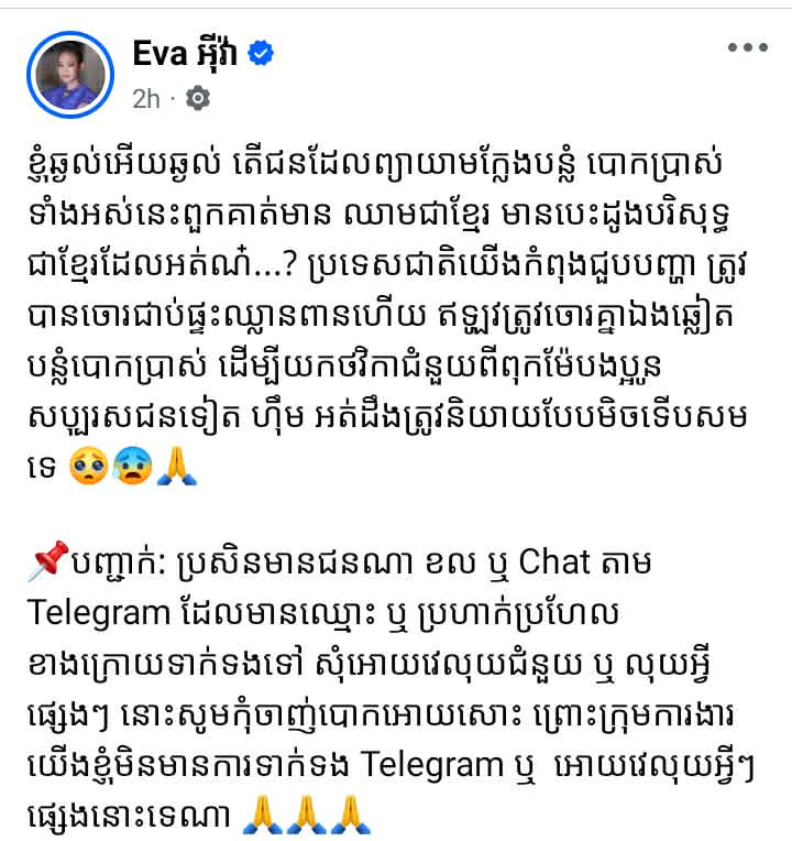 📌នាងបញ្ជាក់ថា ប្រសិនមានជនណា ខល ឬ Chat តាម Telegram ដែលមានឈ្មោះ ឬ ប្រហាក់ប្រហែល ខាងក្រោយទាក់ទងទៅ សុំអោយវេរលុយជំនួយ ឬ លុយអ្វីផ្សេងៗ នោះសូមកុំចាញ់បោកអោយសោះ ព្រោះក្រុមការងារយើងខ្ញុំមិនមានការទាក់ទង Telegram ឬ អោយវេលុយអ្វីៗផ្សេងនោះទេណា ។