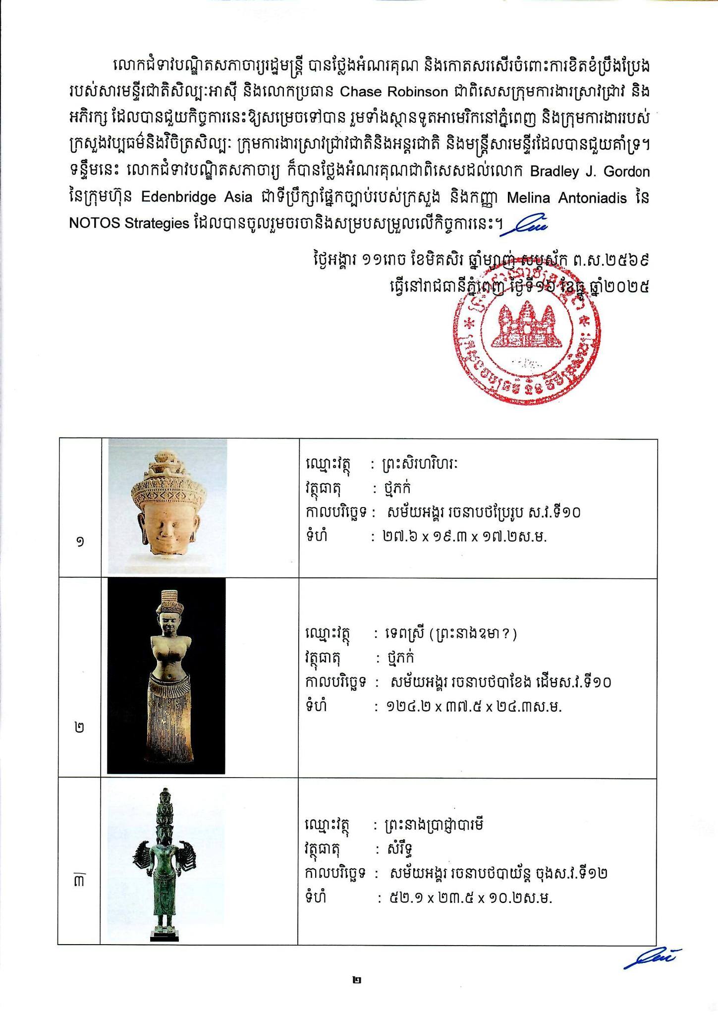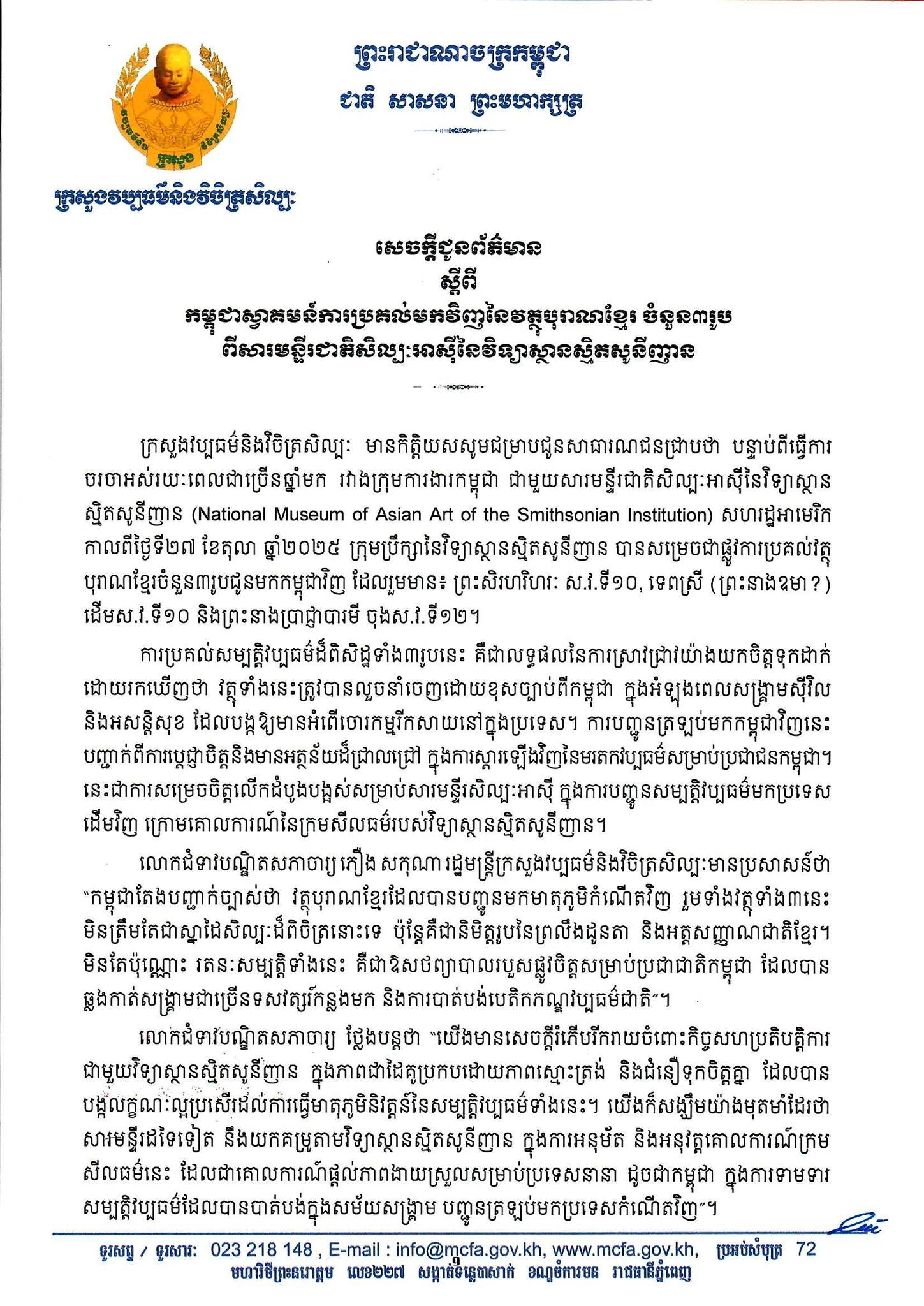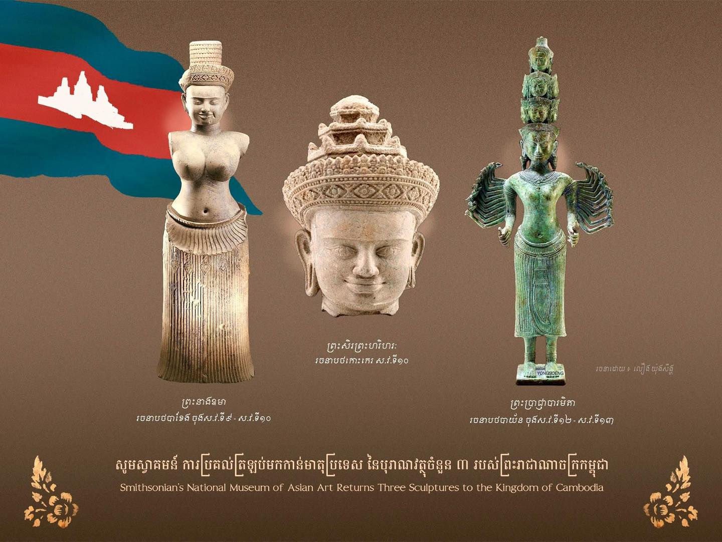 ជាក់ស្តែង ក្រសួងវប្បធម៌ និងវិចិត្រសិល្បៈ បានប្រកាសនាព្រឹកថ្ងៃទី១៧ ខែធ្នូ ឆ្នាំ២០២៥នេះថា ៖ ក្រសួងវប្បធម៌ និងវិចិត្រសិល្បៈ សូមជម្រាបជូនសាធារណជនជ្រាបថា បន្ទាប់ពីធ្វើការចរចា អស់រយៈពេលជាច្រើនឆ្នាំមក រវាងក្រុមការងារកម្ពុជាជាមួយសារមន្ទីរជាតិសិល្បៈអាស៊ីនៃវិទ្យាស្ថានស្មិតសូនីញាន (National Museum of Asian Art of the Smithsonian Institution) សហរដ្ឋអាមេរិក កាលពីថ្ងៃទី២៧ ខែតុលា ឆ្នាំ២០២៥ ក្រុមប្រឹក្សានៃវិទ្យាស្ថានស្មិតសូនីញាន បានសម្រេចជាផ្លូវការ ប្រគល់វត្ថុបុរាណខ្មែរចំនួន៣ រូបជូនមកកម្ពុជាវិញ ដែលរួមមាន ៖ ព្រះសិរហរិហរៈ ស.វ.ទី១០, ទេពស្រី (ព្រះនាងឧមា0x017d7) ដើមស.វ.ទី១០ និងព្រះនាងប្រាជ្ញាបារមី ចុងស.វ.ទី១២ ។
