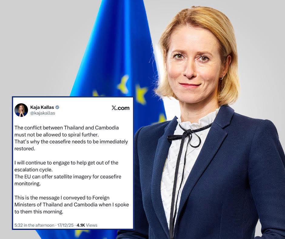 អឺរ៉ុប ៖ ជម្លោះរវាងប្រទេសកម្ពុជា និងប្រទេសថៃ មិនត្រូវបណ្តោយឱ្យរាលដាលកាន់តែធ្ងន់ធ្ងរឡើយ។ ហេតុដូច្នេះហើយ បទឈប់បាញ់ចាំបាច់ត្រូវតែស្តារឡើងវិញជាបន្ទាន់! នេះបើយោងតាមសេចក្តីថ្លែងការណ៍របស់លោកស្រី Kaja Kallas តំណាងជាន់ខ្ពស់សហភាពអឺរ៉ុប ទទួលបន្ទុកកិច្ចការបរទេស និងគោលនយោបាយសន្តិសុខ និងជាអនុប្រធានគណៈកម្មការអឺរ៉ុប ក្នុងកិច្ចពិភាក្សានាព្រឹកថ្ងៃទី១៧ ខែធ្នូនេះ ។