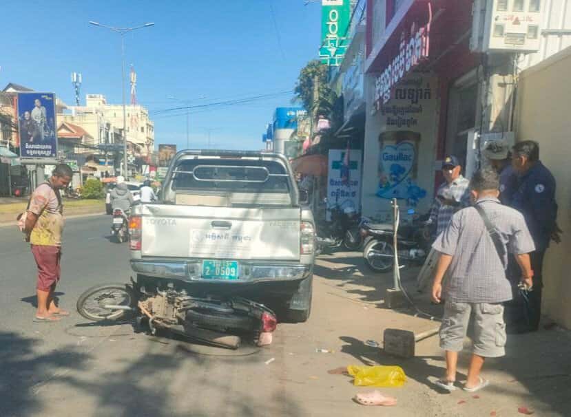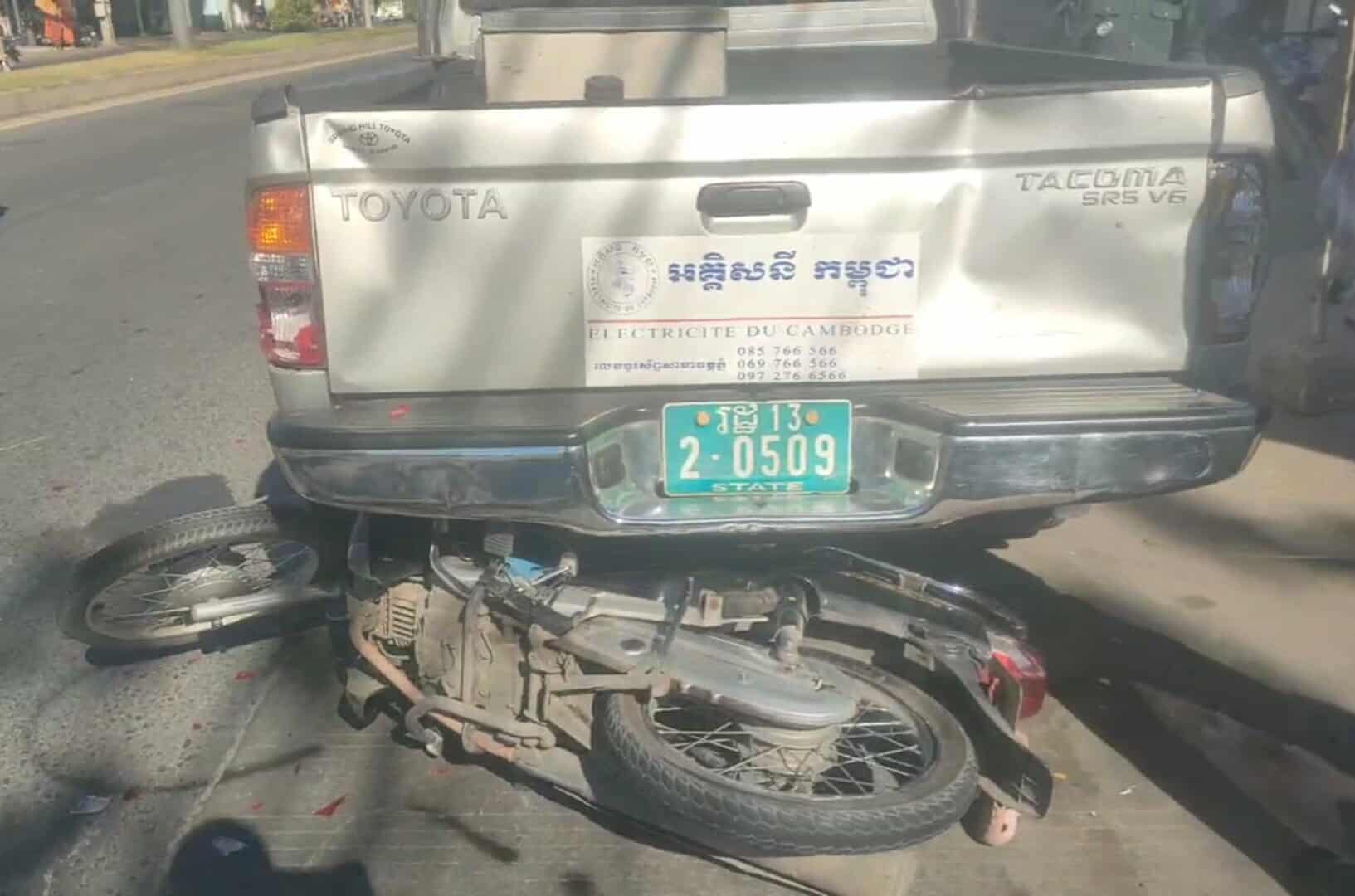 រាជធានីភ្នំពេញ ៖ យុវជន២នាក់ បានរងរបួសធ្ងន់ស្រាល ខណៈពេលជិៈម៉ូតូ ១គ្រឿង បើកលឿនប៉ះរថយន្ត១គ្រឿង ក៏ជ្រុលទៅបុកពីក្រោយរថយន្តក្រុមហ៊ុនអគ្គិសនីកម្ពុជា ដែលឈប់លើចិញ្ចើមផ្លូវ ជួសជុលអគ្គិសនី ។