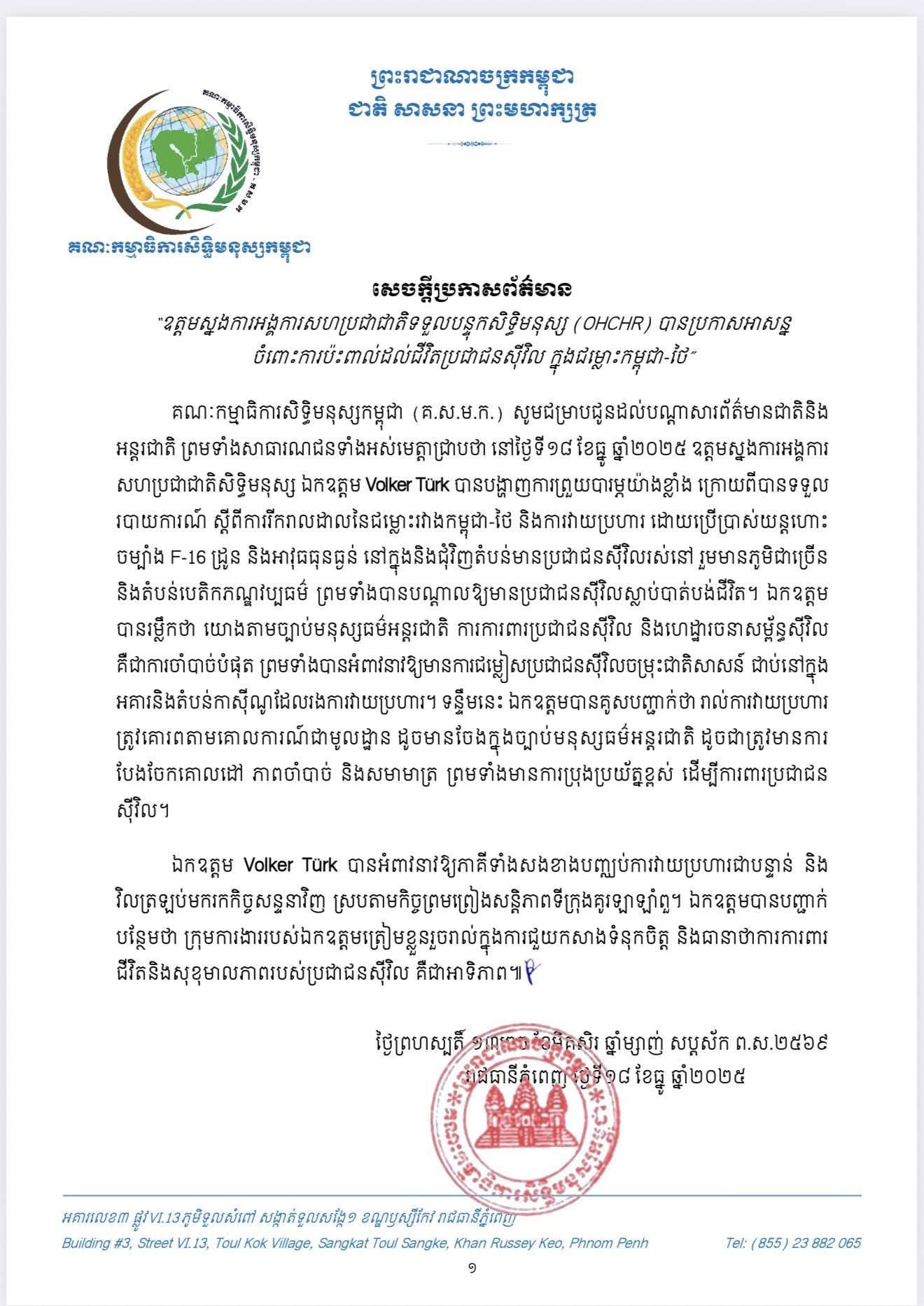 គណៈកម្មាធិការសិទ្ធិមនុស្សកម្ពុជា (គ.ស.ម.ក.) សូមជម្រាបជូនដល់បណ្តាសារព័ត៌មានជាតិ និងអន្តរជាតិ ព្រមទាំងសាធារណជនទាំងអស់មេត្តាជ្រាបថា នៅថ្ងៃទី១៨ ខែធ្នូ ឆ្នាំ២០២៥ ឧត្តមស្នងការអង្គការ សហប្រជាជាតិសិទ្ធិមនុស្ស ឯកឧត្តម Volker Türk បានបង្ហាញការព្រួយបារម្ភយ៉ាងខ្លាំង ក្រោយពីបានទទួល របាយការណ៍ ស្តីពីការរីករាលដាល នៃជម្លោះរវាងកម្ពុជា-ថៃ និងការវាយប្រហារ ដោយប្រើប្រាស់យន្តហោះ ចម្បាំង F-16 ដូន និងអាវុធធុនធ្ងន់ នៅក្នុងនិងជុំវិញតំបន់មានប្រជាជនស៊ីវិលរស់នៅ រួមមានភូមិជាច្រើន និងតំបន់បេតិកភណ្ឌវប្បធម៌ ព្រមទាំងបានបណ្តាលឱ្យមានប្រជាជនស៊ីវិលស្លាប់បាត់បង់ជីវិត ។