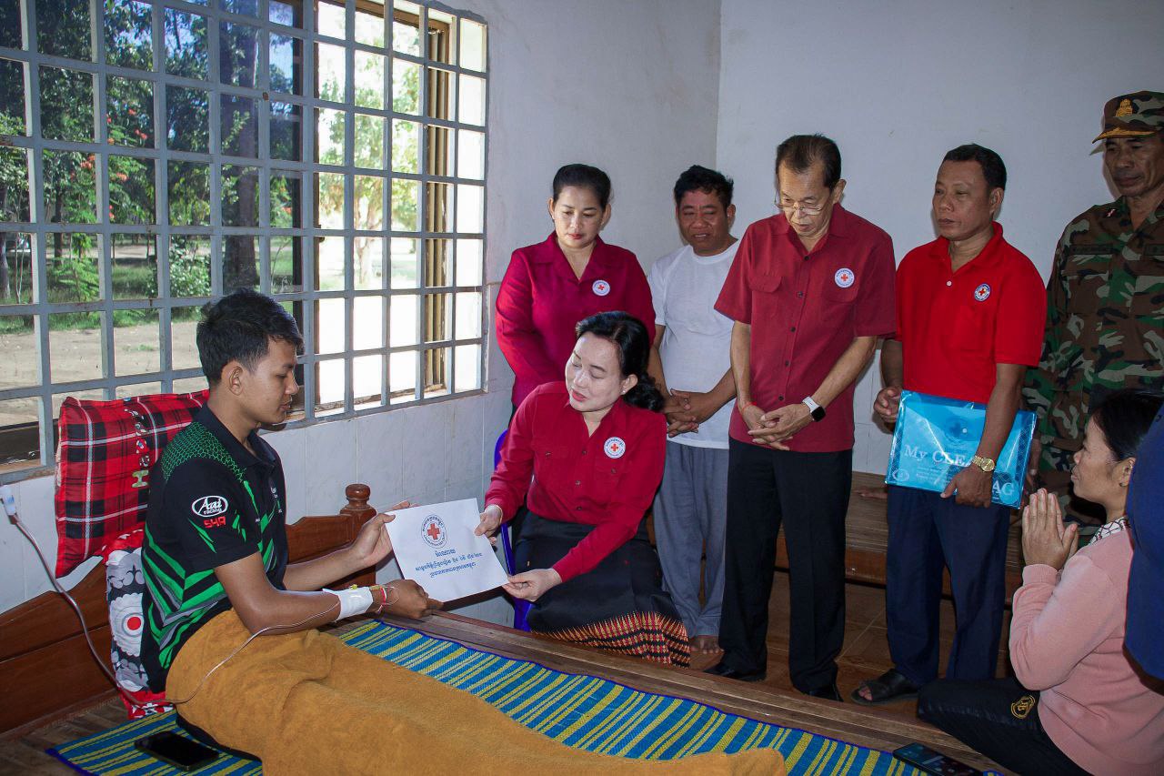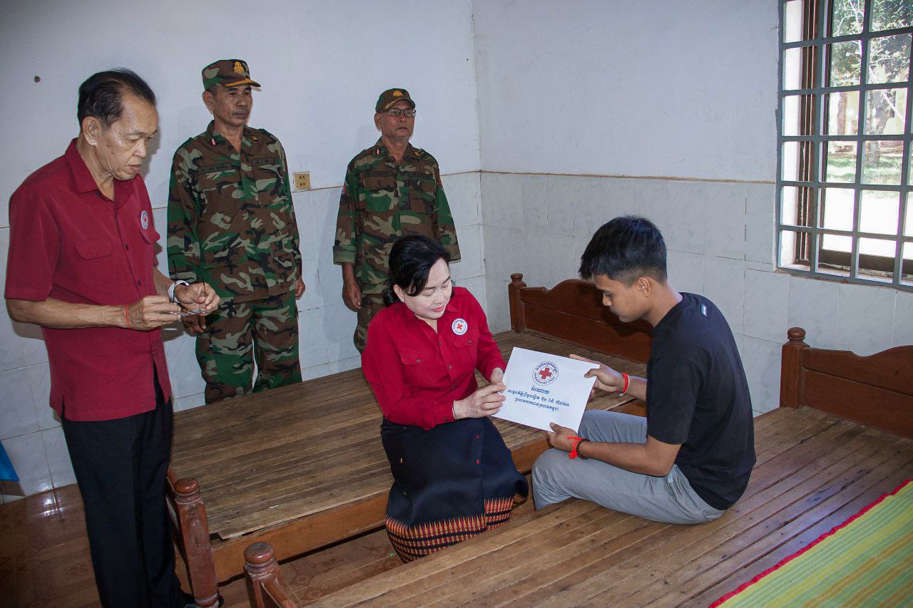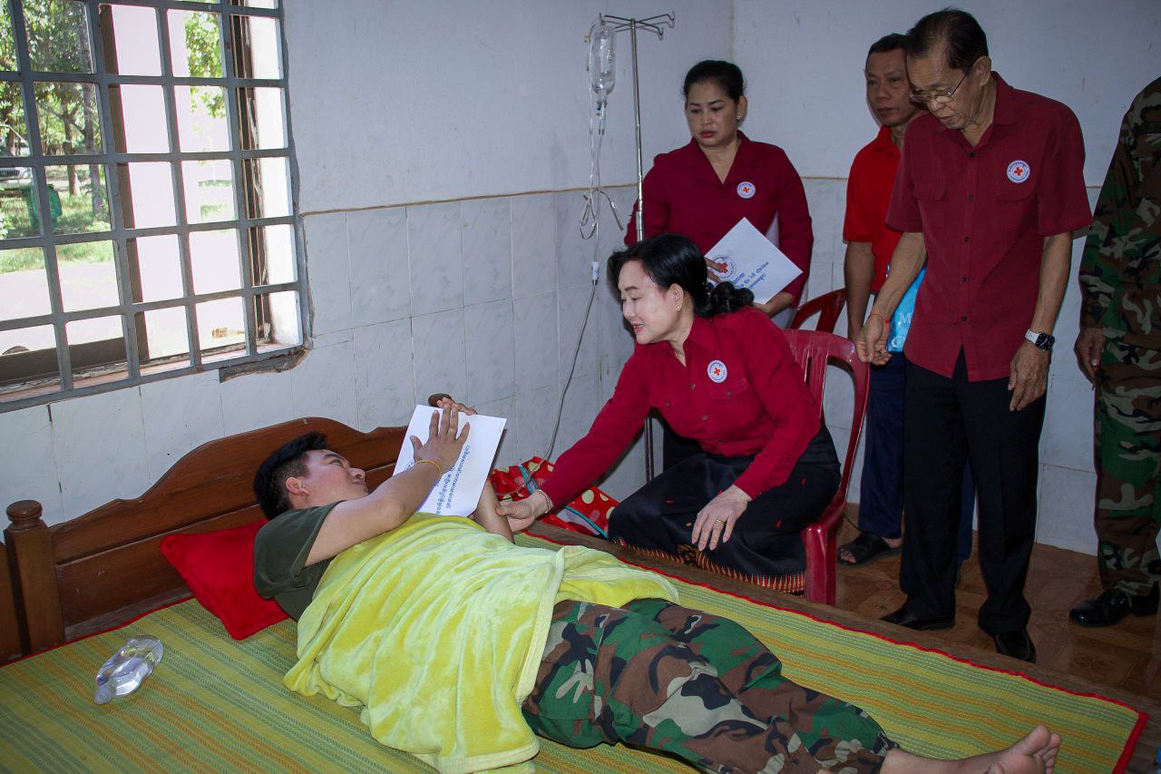 លោកជំទាវ ក៏បាននាំយកបណ្តាំផ្ញើសាកសួរសុខដោយក្តីនឹករលឹក និងអាណិតអាសូរបំផុត ពីឯកឧត្តម អ៊ុន ចាន់ដា ប្រធានគណៈកម្មាធិការសាខា និងឯកឧត្តម សន្តិបណ្ឌិត នេត សាវឿន ប្រធានកិត្តិយសសាខា ពិសេសពី សំណាក់ សម្តេចកិត្តិព្រឹទ្ធបណ្ឌិត ប៊ុន រ៉ានី ហ៊ុនសែន ប្រធានកាកបាទក្រហមកម្ពុជា ដែលជានិច្ចកាល សម្តេចប្រធាន តែងតែ បានណែនាំអោយ គ្រប់បណ្តាញការងារគ្រប់ថ្នាក់ របស់កាកបាទក្រហមកម្ពុជា យកចិត្តទុកដាក់ ជួយដោះស្រាយសម្រាលទុក្ខលំបាកដល់ពលរដ្ឋរងគ្រោះ និង ងាយរងគ្រោះ អោយទាន់ពេលវេលា ពិសេស ត្រូវគិតគូរ ផ្តោតអាទិភាពទៅលើយោធិនរបួស ពិការ យោធិនមានជម្ងឺ គ្រួសារកងទ័ពជួរមុខ និងពលរដ្ឋភៀសសឹក ជាសំខាន់ ។