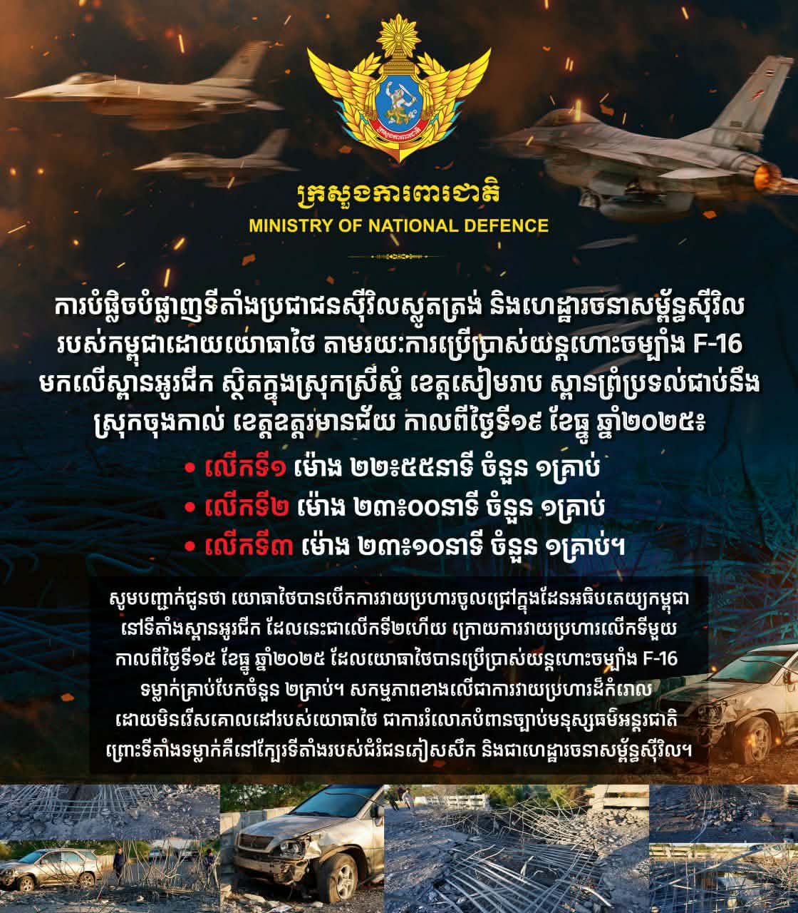 រាជធានីភ្នំពេញ ៖ ក្រសួងការពារជាតិកម្ពុជាបានបង្ហាញពីការបំផ្លិចបំផ្លាញទីតាំងប្រជាជនស៊ីវិលស្លូតត្រង់ និងហេដ្ឋារចនាសម្ព័ន្ធស៊ីវិលរបស់កម្ពុជាដោយយោធាថៃ តាមរយៈការប្រើប្រាស់យន្តហោះចម្បាំង F-16 ។