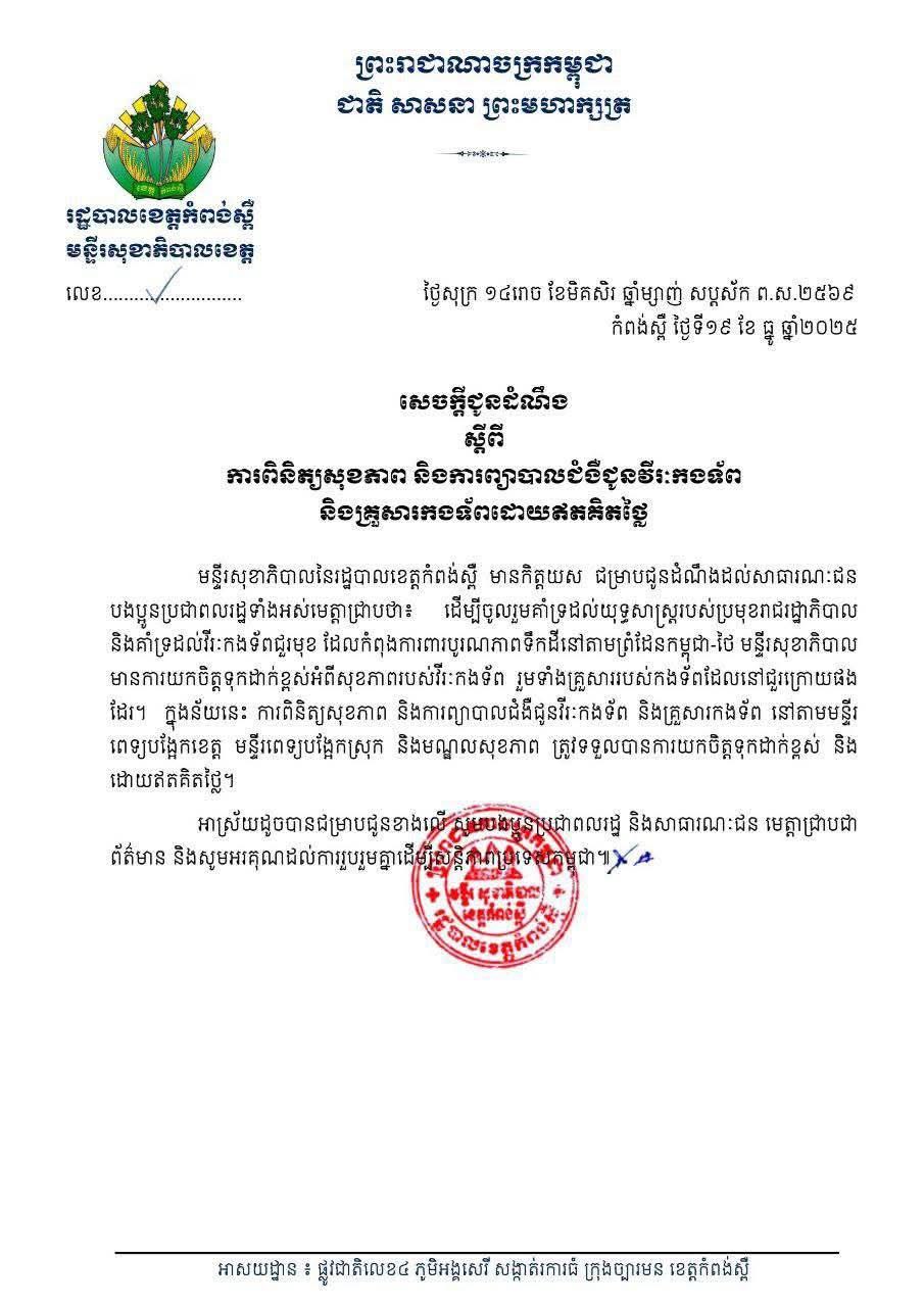 ខេត្តកំពង់ស្ពឺ ៖ មន្ទីរសុខាភិបាល នៃរដ្ឋបាលខេត្តកំពង់ស្ពឺ បានចេញសេចក្តីជូនដំណឹង កាលពីថ្ងៃទី១៩ ខែធ្នូ ឆ្នាំ២០២៥ អំពីការពិនិត្យ ព្យាបាលជំងឺជូនវិរកងទ័ព…