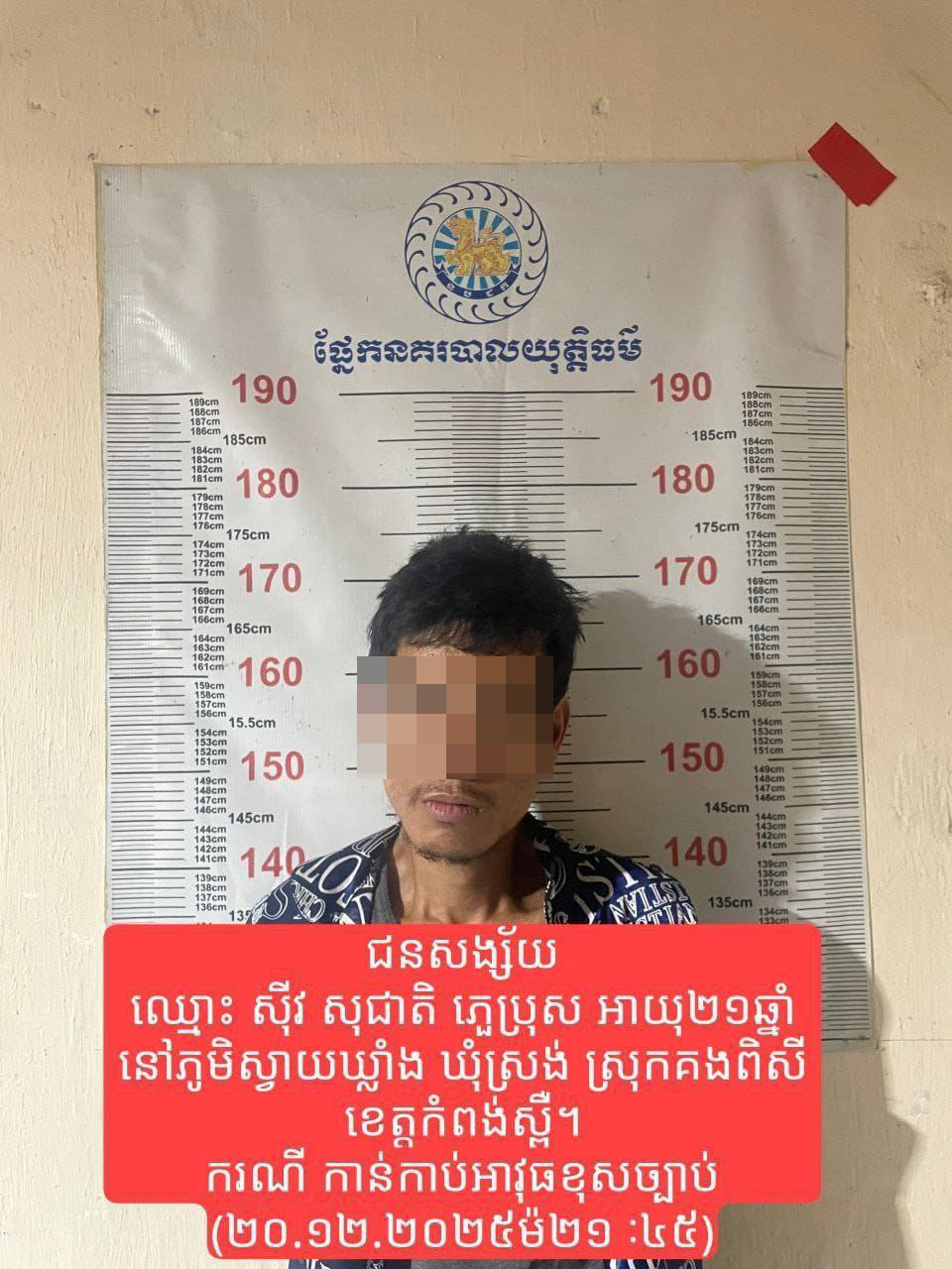 ហេតុការណ៍ឃាត់ខ្លួនយុវជនសង្ស័យកាន់កាប់អាវុធខុសច្បាប់បានធ្វើឡើងកាលពីវេលាម៉ោង១១និង៣០នាទីរំលងអាធ្រាត្រថ្ងៃទី២០ ខែធ្ន ឆ្នាំ២០២៥ នៅតាមបណ្តោយផ្លូវជាតិលេខ៤១ ស្ថិតនៅក្នុងភូមិក្រាំងឃ្នង ឃុំស្រង់ ស្រុកគងពិសី ខេត្តកំពង់ស្ពឺ។