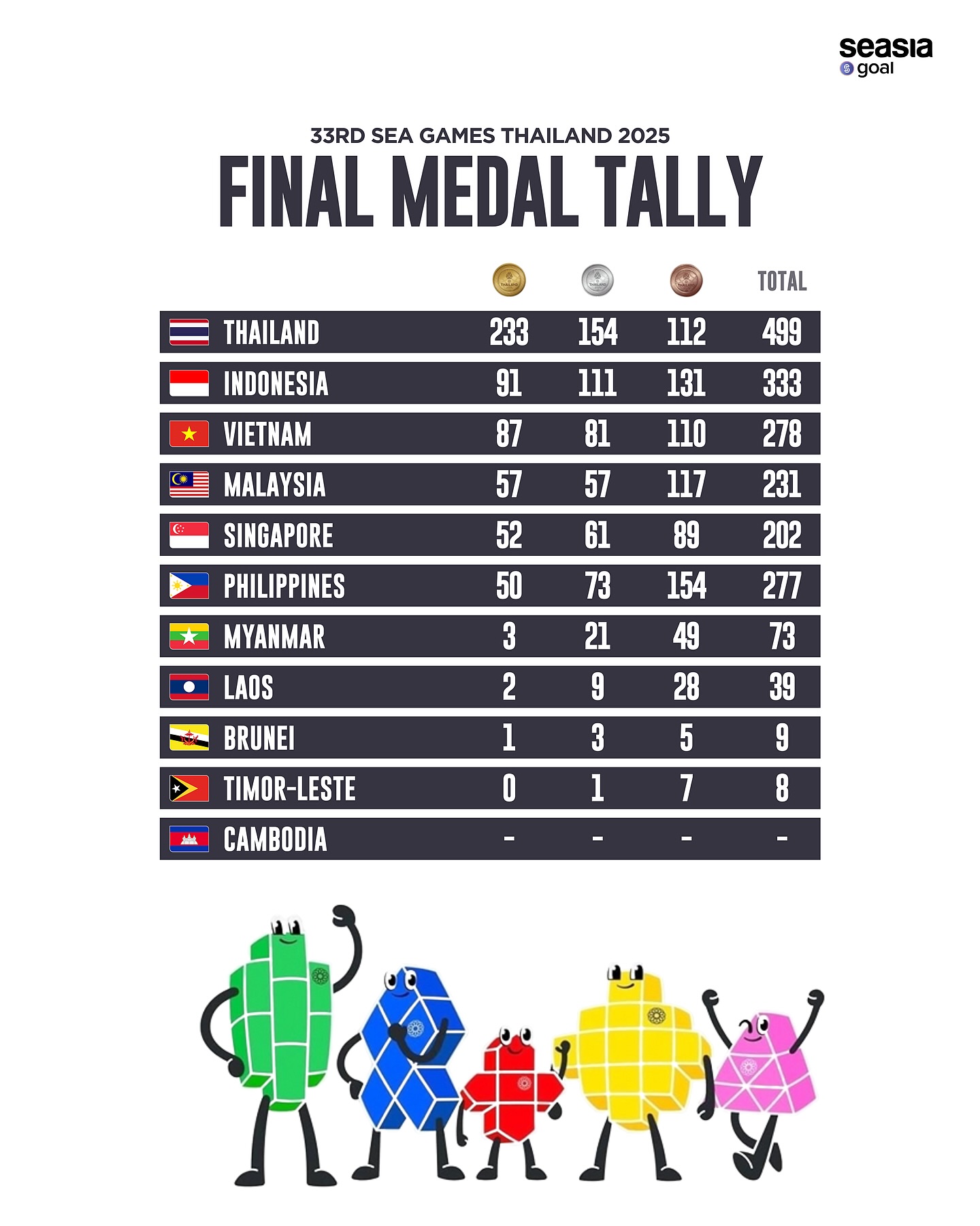 បញ្ចប់ព្រឹត្តិការណ៍កីឡាស៊ីហ្គេមលើកទី ៣៣ ប្រទេសឥណ្ឌូណេស៊ីឈរនៅចំណាត់ថ្នាក់លេខ ២ ដោយឈ្នះមេដាយសុរុប ៣៣៣ គ្រឿងក្នុងនោះមាស ៩១ គ្រឿង។ វៀតណាមឈ្នះមេដាយសរុប ២៧៨ មាស ៨៧ គ្រឿង។ ម៉ាឡេស៊ីនៅចំណាត់ថ្នាក់លេខ ៤ ជាមួយ មេដាយសរុប ២៣១ គ្រឿង មាស ៥៧ គ្រឿង បន្ទាប់មកគឺសិង្ហបុរីមេដាយសរុប ២០២ គ្រឿង មាស ៥២ គ្រឿង។ ប្រទេសឈរនៅក្រៅតំណែងកំពូលទាំង ៥ (Top 5) រួមមាន ហ្វីលីពីន មីយ៉ាន់ម៉ា ឡាវ ព្រុយណេ និងទីម័រខាងកើត។