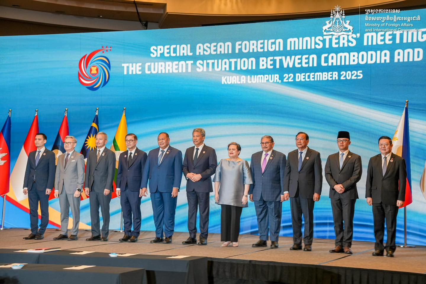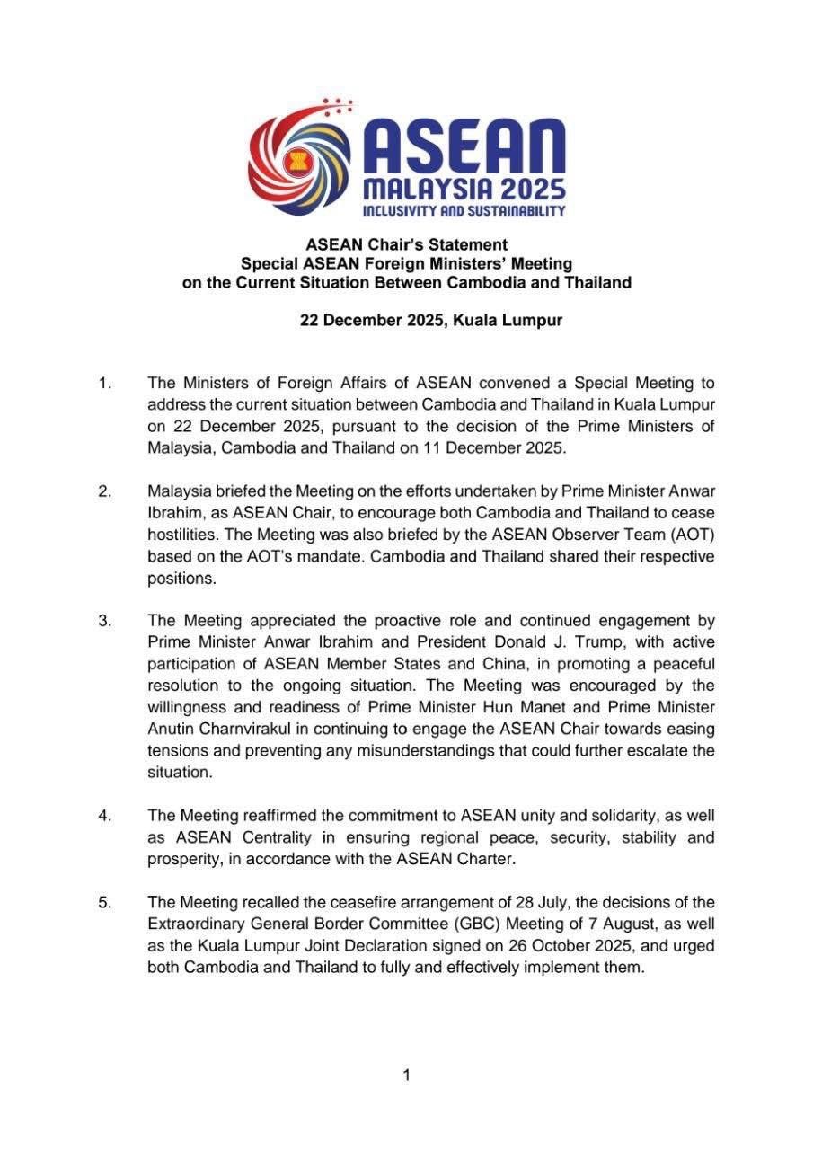 ១. រដ្ឋមន្ត្រីការបរទេសអាស៊ានបានកោះប្រជុំពិសេសមួយ ដើម្បីដោះស្រាយស្ថានភាពបច្ចុប្បន្នរវាងកម្ពុជា និង ថៃ នៅទីក្រុងកូឡាឡាំពួរ នៅថ្ងៃទី២២ ខែធ្នូ ឆ្នាំ២០២៥ ស្របតាមសេចក្តីសម្រេចរបស់នាយករដ្ឋមន្ត្រីម៉ាឡេស៊ី កម្ពុជា និងថៃ នៅថ្ងៃទី១១ ខែធ្នូ ឆ្នាំ២០២៥។