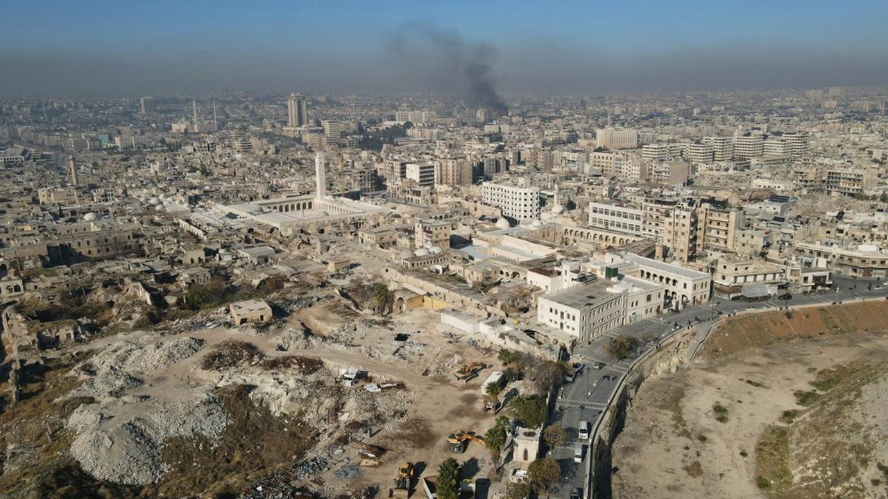 This aerial view shows smoke billowing from the surroundings of the northern Syrian city of Aleppo after jihadists and their allies entered the northern Syrian city, early on November 30, 2024. Hayat Tahrir al-Sham (HTS) jihadists and their Turkish-backed allies breached Syria’s second city of Aleppo on November 29, as they pressed a lightning offensive against forces of the Iranian- and Russian-backed government. (Photo by Mohammed AL-RIFAI / AFP)
