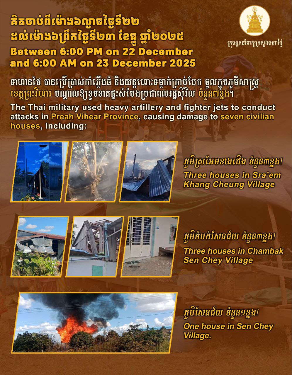 ខេត្តព្រះវិហារ ៖ ក្រសួងការពារជាតិ បានប្រកាសនាព្រឹកថ្ងៃទី២៣ ខែធ្នូ ឆ្នាំ២០២៥នេះថា ៖ ចន្លោះពីម៉ោង ៦ល្ងាច ថ្ងៃទី២២ ដល់ម៉ោង៦ព្រឹក ថ្ងៃទី២៣ ខែធ្នូ ឆ្នាំ២០២៥ ទាហានថៃ បានប្រើប្រាស់កាំភ្លើ.ងធំ និងយន្តហោះទម្លាក់គ្រាប់បែក ចូលក្នុងភូមិសាស្ត្រខេត្តព្រះវិហារ បណ្តាលឱ្យខូចខាតផ្ទះសំបែងប្រជាពលរដ្ឋស៊ីវិលចំនួន៧ខ្នង ។