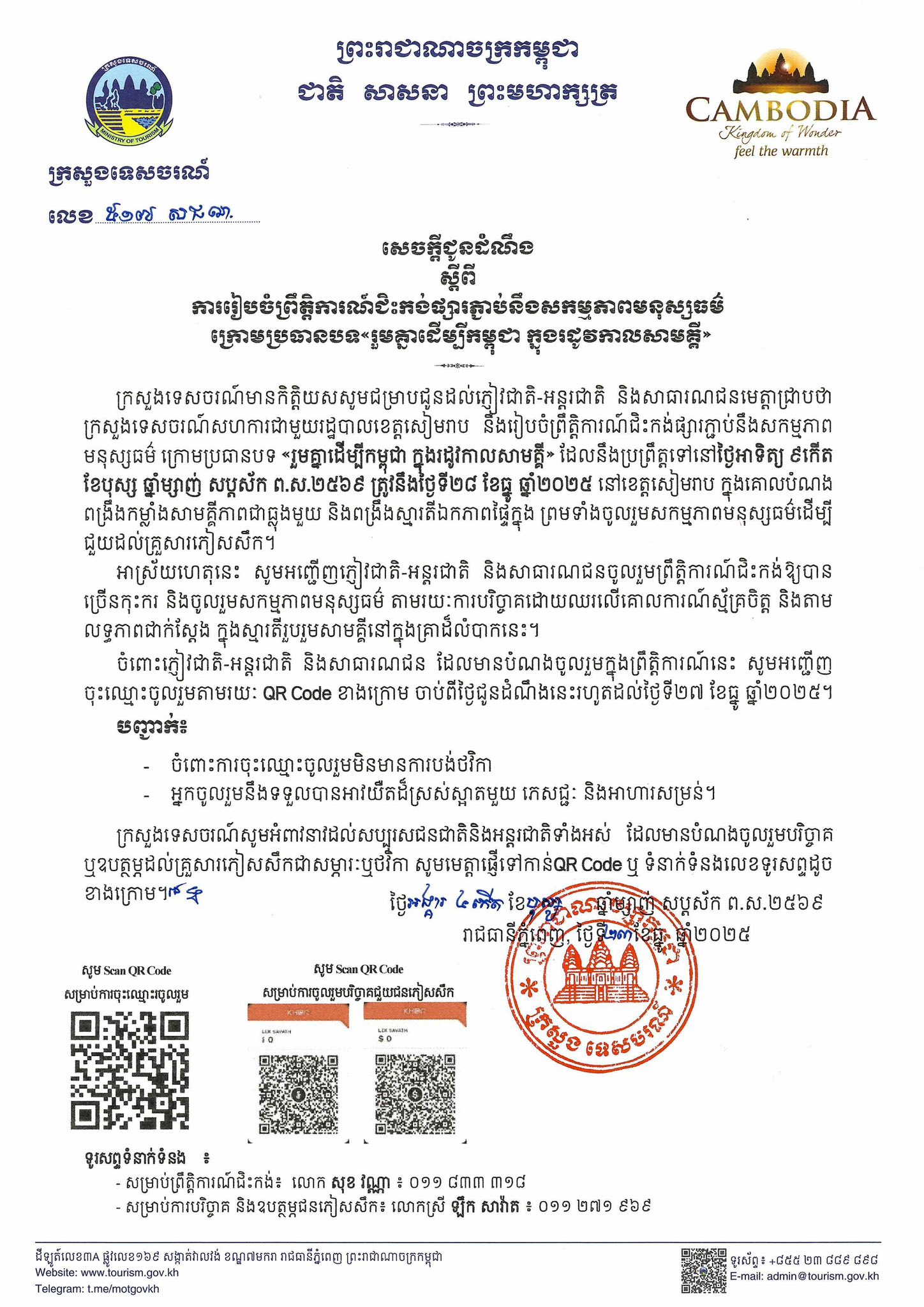 រាជធានីភ្នំពេញ ៖ ក្រសួងទេសចរណ៍ នៅថ្ងៃទី ២៣ ខែធ្នូ ឆ្នាំ ២០២៥ នេះបានឱ្យដឹងថា ក្រសួងទេសចរណ៍សហការជាមួយរដ្ឋបាលខេត្តសៀមរាប នឹងរៀបចំព្រឹត្តិការណ៍ជិះកង់ផ្សារភ្ជាប់នឹងសកម្មភាព មនុស្សធម៌ ក្រោមប្រធានបទ «រួមគ្នាដើម្បីកម្ពុជា ក្នុងរដូវកាលសាមគ្គី» ដែលនឹងប្រព្រឹត្តទៅនៅថ្ងៃទី ២៨ ខែធ្នូ ឆ្នាំ ២០២៥ នៅខេត្តសៀមរាប ក្នុងគោលបំណង ពង្រឹងកម្លាំងសាមគ្គីភាពជាធ្លុងមួយ និងពង្រឹងស្មារតីឯកភាពផ្ទៃក្នុង ព្រមទាំងចូលរួមសកម្មភាពមនុស្សធម៌ ដើម្បីជួយដល់គ្រួសារភៀសសឹក ។