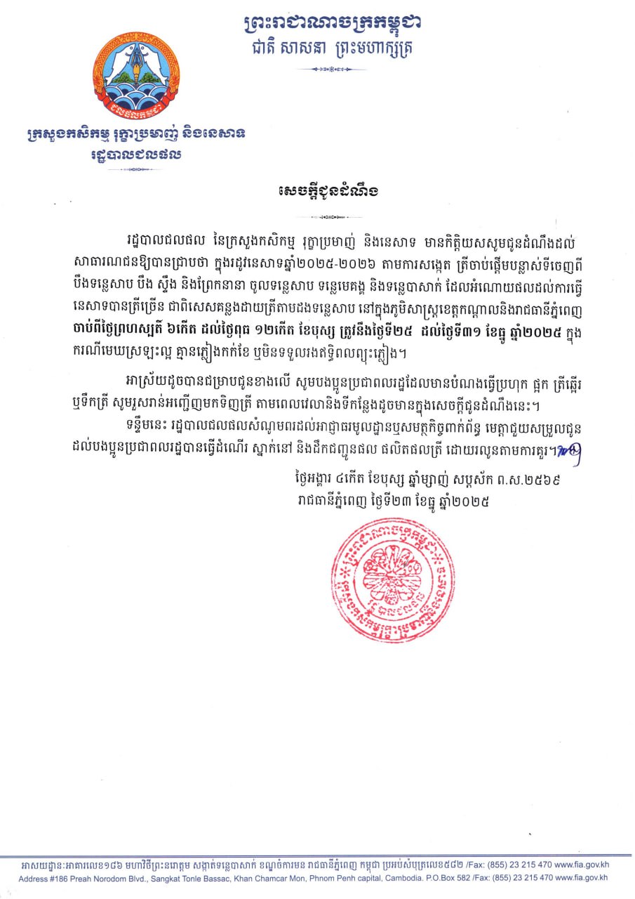 រាជធានីភ្នំពេញ ៖ រដ្ឋបាលជលផល នៃក្រសួងកសិកម្ម រុក្ខាប្រមាញ់ និងនេសាទ នៅថ្ងៃទៅ ២៣ ខែធ្នូ ឆ្នាំ ២០២៥ នេះបានជូនដំណឹងដល់សាធារណជនក្នុងរដូវនេសាទឆ្នាំ ២០២៥-២០២៦ ថា តាមការសង្កេត ត្រីចាប់ផ្តើមបន្លាស់ទីចេញពីបឹងទន្លេសាប បឹង ស្ទឹង និងព្រែកនានា ចូលទន្លេសាប ទន្លេមេគង្គ និងទន្លេបាសាក់ ដែលអំណោយផលដល់ការធ្វើនេសាទបានត្រីច្រើន ជាពិសេសគន្លងដាយត្រីតាមដងទន្លេសាប នៅក្នុងភូមិសាស្ត្រខេត្តកណ្តាល និងរាជធានីភ្នំពេញ ចាប់ពីថ្ងៃទី ២៥ ដល់ថ្ងៃទី ៣១ ខែធ្នូ ឆ្នាំ ២០២៥ ក្នុងករណីមេឃស្រឡះល្អ គ្មានភ្លៀងកក់ខែ ឬមិនទទួលរងឥទ្ធិពលព្យុះភ្លៀង ។