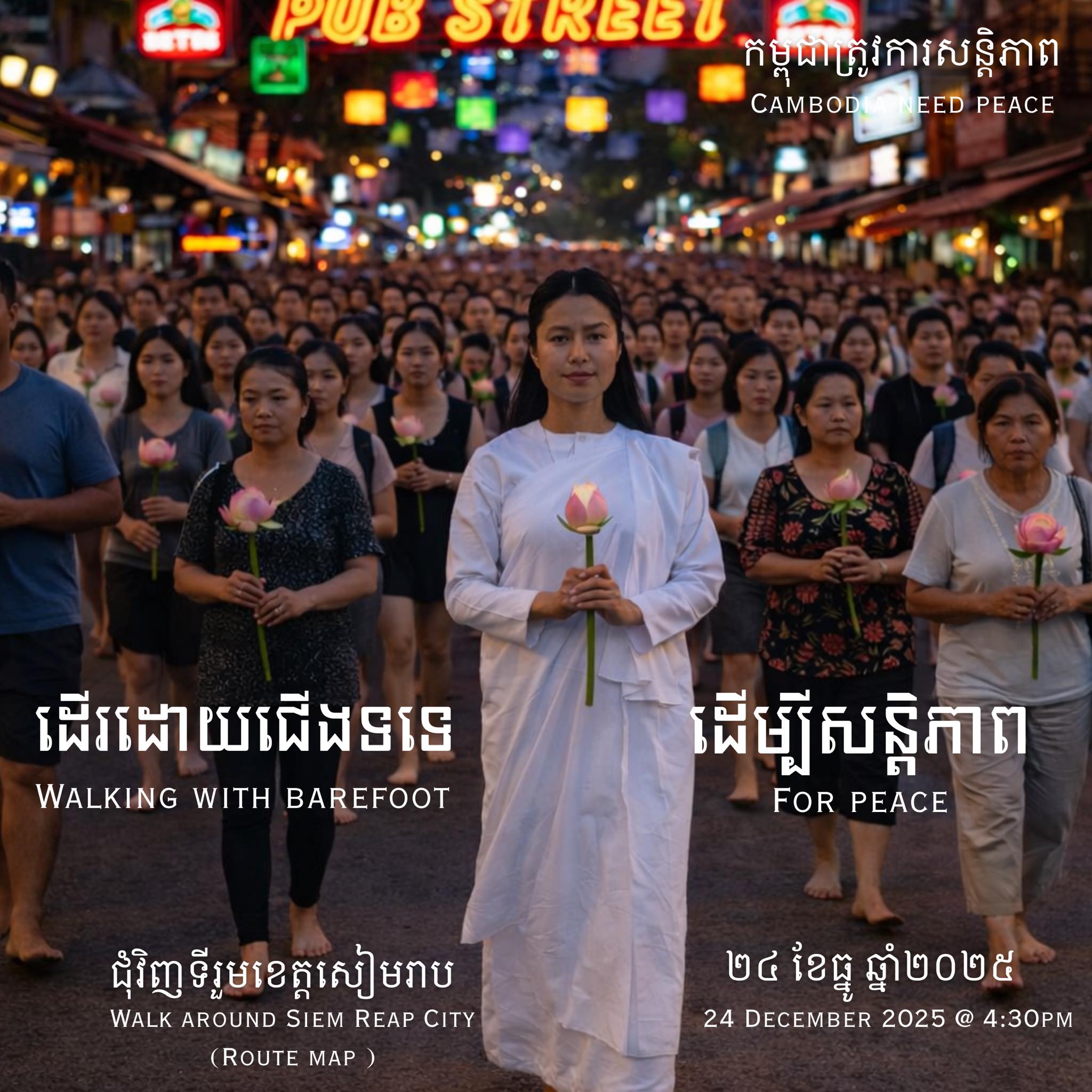 យុទ្ធនាការដើរជើងទទេរ ដើម្បីសន្តិភាពរបស់ នី មុន្នីនាថ នឹងធ្វើឡើងនៅយប់ថ្ងៃទី២៤ ខែធ្នូ ឆ្នាំ២០២៥ នេះ នៅក្នុងខេត្តសៀមរាប ខណៈតាមការរំពឹងទុកសម្រាប់យុទ្ធនាការនេះនឹងមានអ្នកចូលរួមប្រមាណ២ពាន់នាក់ ។