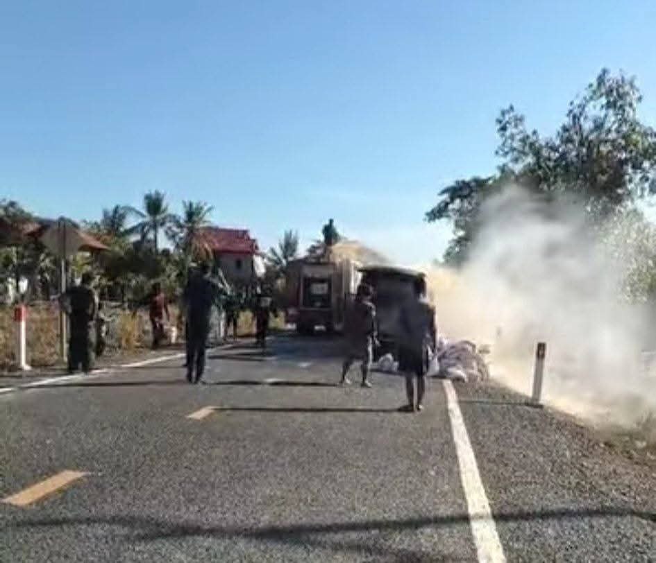 ក្រោយពេលកើតហេតុ សមត្ថកិច្ចបានយករថយន្តពន្លត់អគ្គីភ័យទៅជួយអន្តរាគមន៍បាញ់ទឹកពន្លត់ ប៉ុន្តែរថយន្តទៅបានឆេះស្ទើរទាំងស្រុងទៅហើយ។ ចំពោះការខូចខាតរួមមាន ឆេះរថយន្តទាំងស្រុងមួយគ្រឿង អង្ករចំនួន ៣តោន ទឹកត្រី ទឹកស៊ីអ៊ីវ ចំនួន ៣០០យួរ។