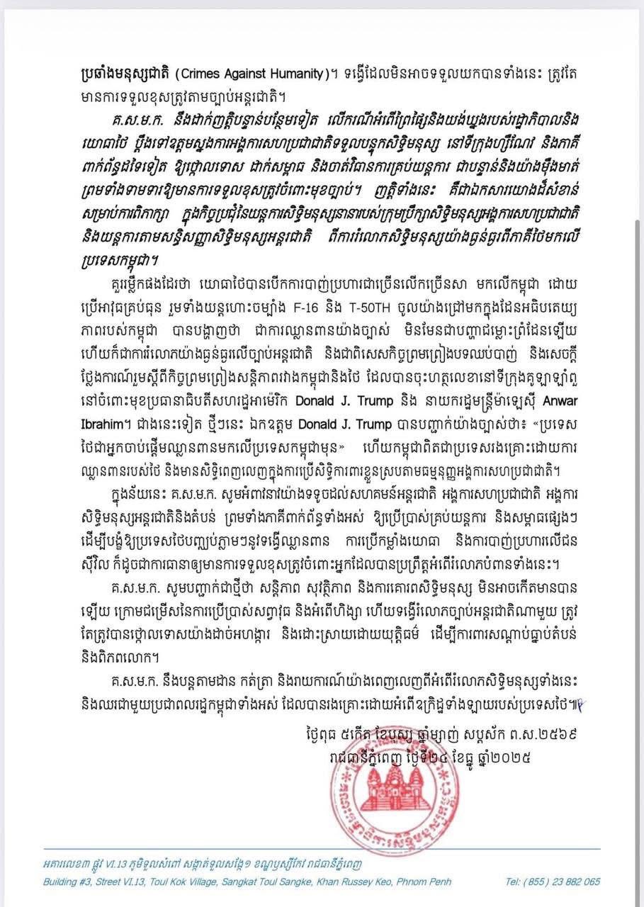 ថ្លែងការណ៍របស់គណៈកម្មាធិការសិទ្ធិមនុស្សកម្ពុជា (គ.ស.ម.ក.) នៅថ្ងៃទី២៤ ខែធ្នូ ឆ្នាំ២០២៥ បានធ្វើការថ្កោលទោសយ៉ាងដាច់អហង្ការចំពោះការបន្តវា.យប្រហារយ៉ាងព្រៃផ្សៃរបស់ប្រទេសថៃ ដោយប្រើប្រាស់សព្វាវុធធុនធ្ងន់យន្តហោះចម្បាំង F-16 និង T-50TH នាវាចម្បាំង ការប្រើប្រាស់ផ្សែងពុល និងគ្រាប់បែកចង្កោម មកលើទីតាំងភូមិសាស្ត្រដែលមានប្រជាជនស៊ីវិលរស់នៅក្នុងខេត្តបន្ទាយមានជ័យ ពោធិ៍សាត់ ឧត្តរមានជ័យ បាត់ដំបង ព្រះវិហារ និងកោះកុង ។