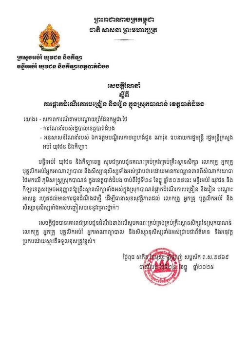 យោងតាមសេចក្តីណែនាំរបស់ក្រសួងអប់រំយុវជននិងកីឡាស្តីពីការផ្អាកដំណើរការបង្រៀន និងរៀន ក្នុងស្រុកបាណន់ ខេត្តបាត់ដំបងបានលើកឡើងថាដោយសារសភាពការណ៍តាមបណ្តោយព្រំដែនកម្ពុជា-ថៃ សូមជម្រាបជូនគណៈគ្រប់គ្រងគ្រប់គ្រឹះស្ថានសិក្សា លោកគ្រូ អ្នកគ្រូ បុគ្គលិកអប់រំអ្នកអាណាព្យាបាល និងសិស្សានុសិស្សទាំងអស់ជ្រាបថាដោយមានការឈ្លានពានពីសំណាក់យោធា ថៃមកលើ ភូមិសាស្ត្រស្រុកបាណន់ ក្នុងខេត្តបាត់ដំបង ចាប់ពីថ្ងៃទី២៤ ខែធ្នូ ឆ្នាំ២០២៥នេះ មន្ទីរអប់រំ យុវជន និង កីឡាខេត្តសម្រេចអនុញ្ញាតឱ្យគ្រឹះស្ថានសិក្សាទាំងអស់ក្នុងស្រុកបាណន់ផ្អាកដំណើរការបង្រៀន និងរៀន បណ្តោះ អាសន្ន រហូតដល់មានការជូនដំណឹងជាថ្មី ដើម្បីធានាសុខសុវត្ថិភាពដល់ លោកគ្រូ អ្នកគ្រូ បុគ្គលិកអប់រំ និង សិស្សានុសិស្សទាំងអស់បញ្ចៀសបាននូវគ្រោះថ្នាក់។