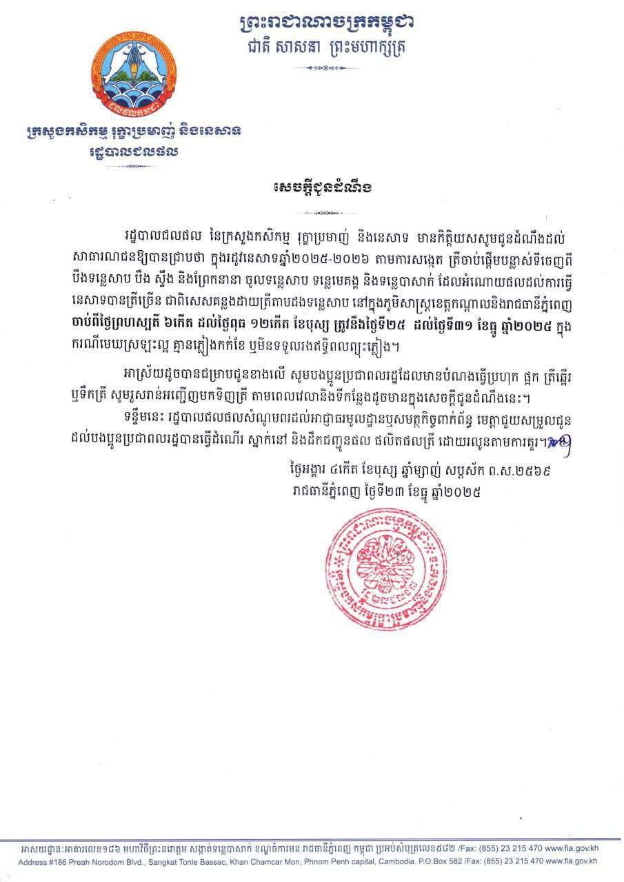 នៅក្នុងសេចក្តីជូនដំណឹងរបស់រដ្ឋបាលជលផល នៃក្រសួងកសិកម្ម រុក្ខាប្រមាញ់ និងនេសាទ មានកិត្តិយសសូមជូនដំណឹងដល់ សាធារណជនឱ្យបានជ្រាបថា ក្នុងរដូវនេសាទឆ្នាំ២០២៥~២០២៦ តាមការសង្កេត ត្រីចាប់ផ្តើមបន្លាស់ទីចេញពី បឹងទន្លេសាប បឹង ស្ទឹង និងព្រែកនានា ចូលទន្លេសាប ទន្លេមេគង្គ និងទន្លេបាសាក់ ដែលអំណោយផលដល់ការធ្វើ នេសាទបានត្រីច្រើន ជាពិសេសគន្លងដោយត្រីតាមដងទន្លេសាប នៅក្នុងភូមិសាស្ត្រខេត្តកណ្តាលនិងរាជធានីភ្នំពេញ ចាប់ពីថ្ងៃព្រហស្បតិ៍ ៦កើត ដល់ថ្ងៃពុធ ១២កើត ខែបុស្ស ត្រូវនឹងថ្ងៃទី២៥ ដល់ថ្ងៃទី៣១ ខែធ្នូ ឆ្នាំ២០២៥ ក្នុង ករណីមេឃស្រឡះល្អ គ្មានភ្លៀងកក់ខែ ឬមិនទទួលរងឥទ្ធិពលព្យុះភ្លៀង។