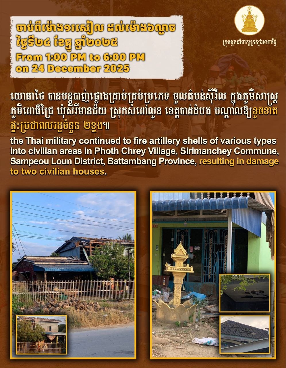 ខេត្តបាត់ដំបង ៖ ក្រសួងមហាផ្ទៃបានប្រកាសនាថ្ងៃទី២៤ ខែធ្នូ ឆ្នាំ២០២៥នេះថា ៖ ចាប់ពីម៉ោង១រសៀល ដល់ម៉ោង៦ល្ងាច ថ្ងៃទី២៤ ខែធ្នូ ឆ្នាំ២០២៥ យោធាថៃ បានបន្តបា.ញ់ផ្លោងគ្រា.ប់គ្រប់ប្រភេទ ចូលតំបន់ស៊ីវិល ក្នុងភូមិសាស្ត្រ ភូមិពោធិ៍ជ្រៃ ឃុំសិរីមានជ័យ ស្រុកសំពៅលូន ខេត្តបាត់ដំបង បណ្តាលឱ្យខូចខាតផ្ទះប្រជាពលរដ្ឋចំនួន ២ខ្នង ។