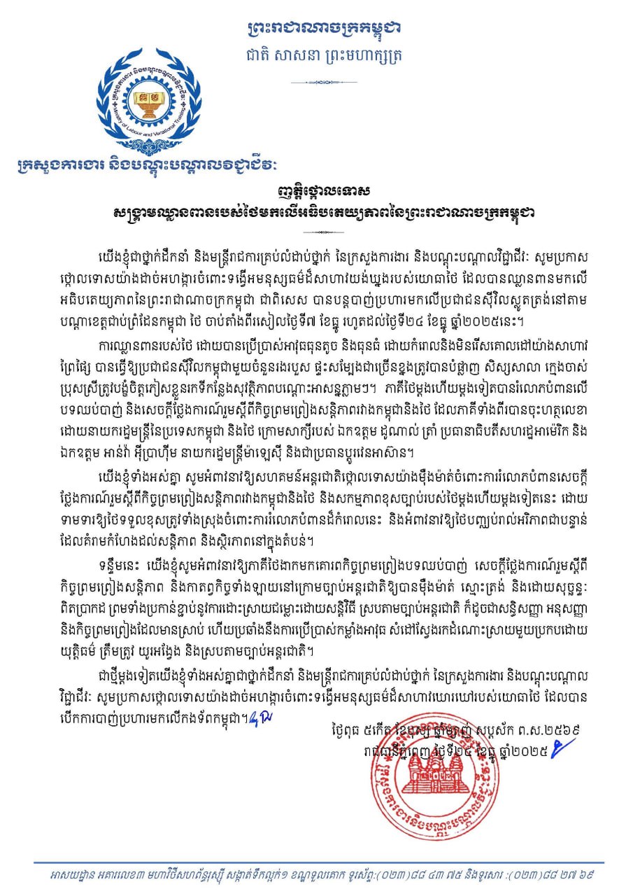 បើតាមក្រសួងការងារ ភាគីថៃម្តងហើយម្ដងទៀតបានរំលោភបំពានលើ បទឈប់បាញ់ និងសេចក្តីថ្លែងការណ៍រួមស្ដីពីកិច្ចព្រមព្រៀងសន្តិភាពរវាងកម្ពុជានិងថៃ ដែលភាគីទាំងពីរបានចុះហត្ថលេខា ដោយនាយករដ្ឋមន្ត្រីនៃប្រទេសកម្ពុជា និងថៃ ក្រោមសាក្សីរបស់ ឯកឧត្តម ដូណាល់ ត្រាំ ប្រធានាធិបតីសហរដ្ឋអាម៉េរិក និង ឯកឧត្តម អាន់វ៉ា អ៊ីប្រាហ៊ីម នាយករដ្ឋមន្ត្រីម៉ាឡេស៊ី និងជាប្រធានប្តូរវេនអាស៊ាន។