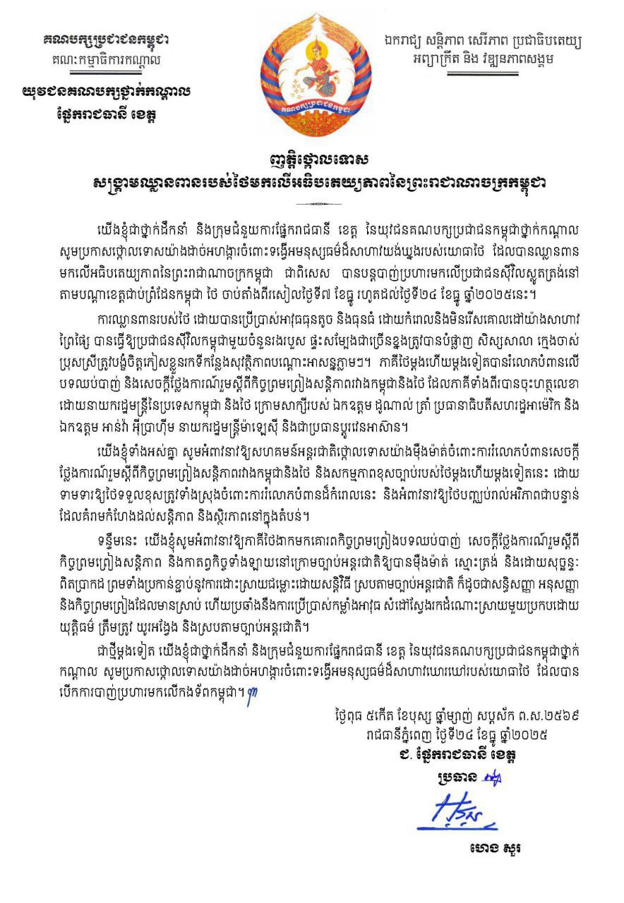 រាជធានីភ្នំពេញ ៖ថ្នាក់ដឹកនាំ និងក្រុមជំនួយការផ្នែករាជធានី ខេត្ត នៃយុវជនគណបក្សប្រជាជនកម្ពុជាថ្នាក់កណ្តាល នៅថ្ងៃទី២៤ ខែធ្នូ ឆ្នាំ២០២៥ បានចេញញត្តិថ្កោលទោសយ៉ាងដាច់អហង្ការចំពោះទង្វើអមនុស្សធម៌ដ៏សាហាវយង់ឃ្នងរបស់យោធាថៃ ដែលបានឈ្លានពានមកលើ អធិបតេយ្យភាពនៃព្រះរាជាណាចក្រកម្ពុជា ជាពិសេស បានបន្តបាញ់ប្រហារមកលើប្រជាជនស៊ីវិលស្លូតត្រង់នៅតាម បណ្តាខេត្តជាប់ព្រំដែនកម្ពុជា ថៃ ចាប់តាំងពីរសៀលថ្ងៃទី៧ ខែធ្នូ រហូតដល់ថ្ងៃទី២៤ ខែធ្នូ ឆ្នាំ២០២៥នេះ ។