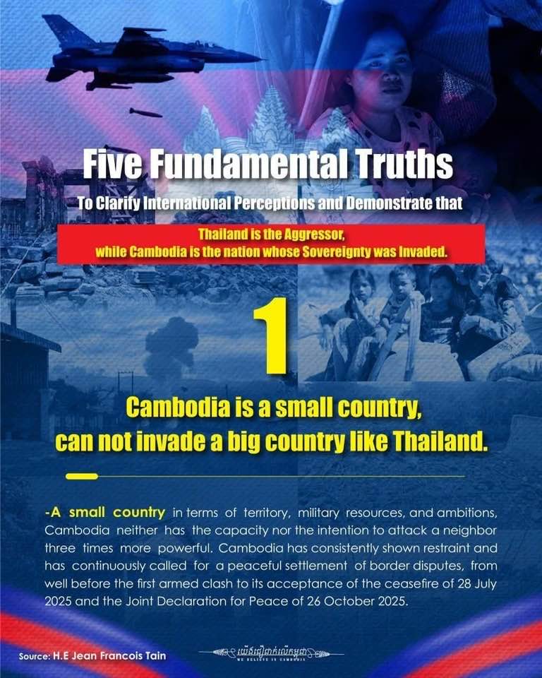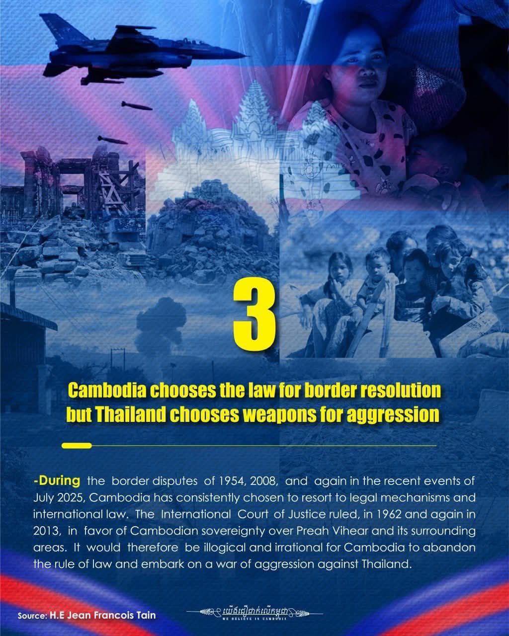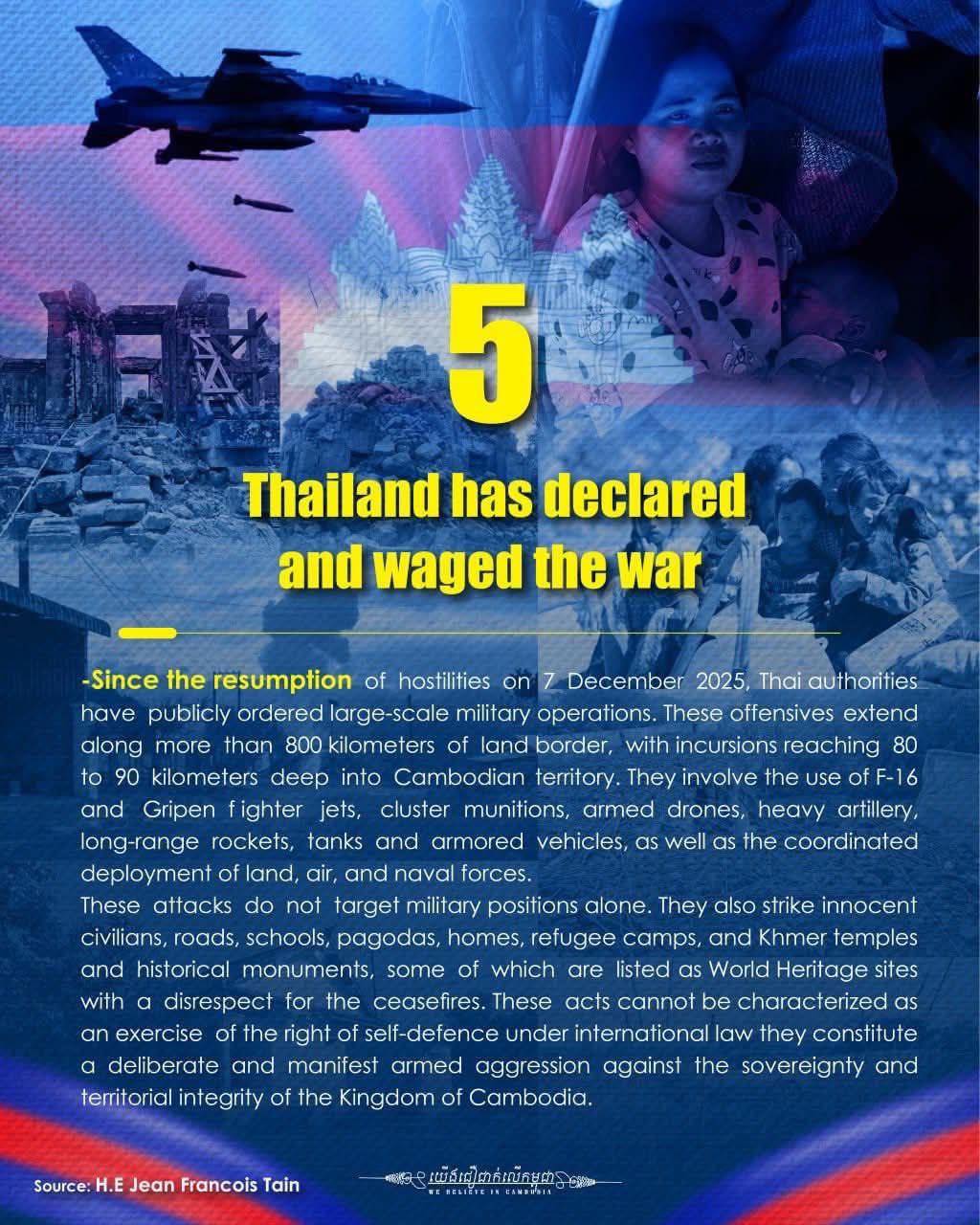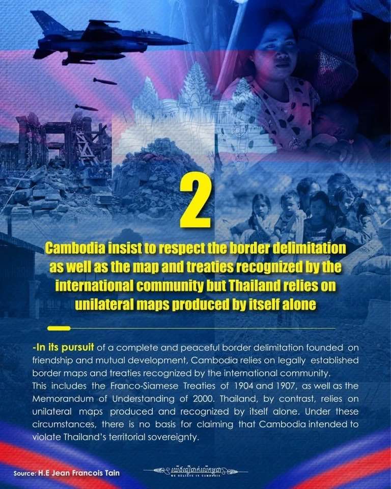 ២.«សង្គ្រាមថៃ ឈ្លានពានកម្ពុជា»នេះ គឺ ជាព្រៃយុទ្ធសាស្ត្រមួយ ដែលនៅក្នុងនោះ គេបោះចោល ក្នុងធុងសម្រាមប្រវត្តិសាស្ត្រ នូវប៊ិចសរសេរ សន្ធិសញ្ញា កិច្ចព្រមព្រៀង និងផែនទីផ្លូវការ ដើម្បីគូសបន្ទាត់ព្រំដែនឡើងវិញ ដោយប្រើប្រាស់ កម្លាំងបាយ, យន្តហោះចម្បាំង F-16, T-50TH, Gripen, គ្រាប់បែកចង្កោម, ផ្សែងពុល, ដ្រូនពិឃាដ, ដ្រូនទម្លាក់គ្រាប់បែក, រថក្រោះ, រថពាសដែក.. ។