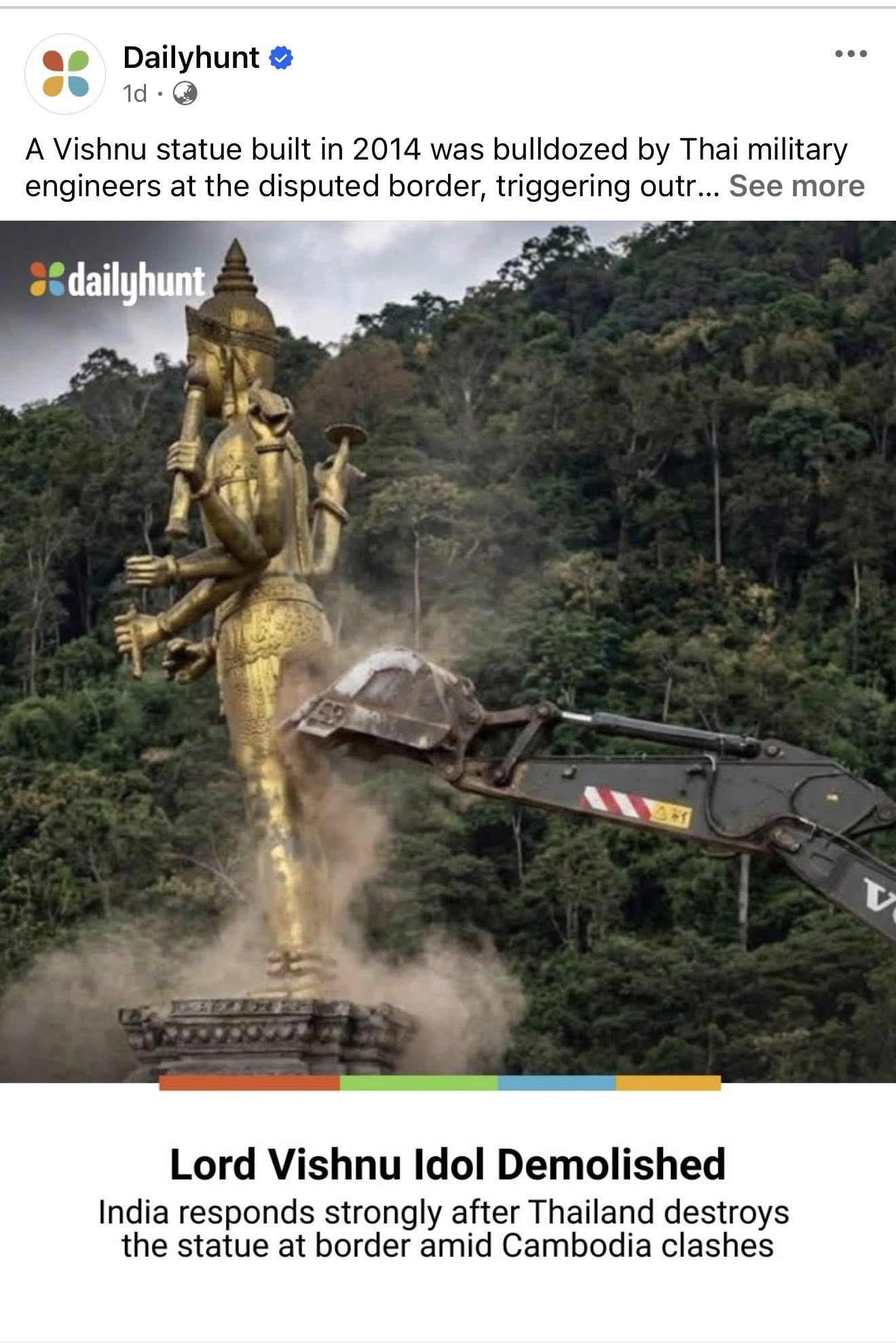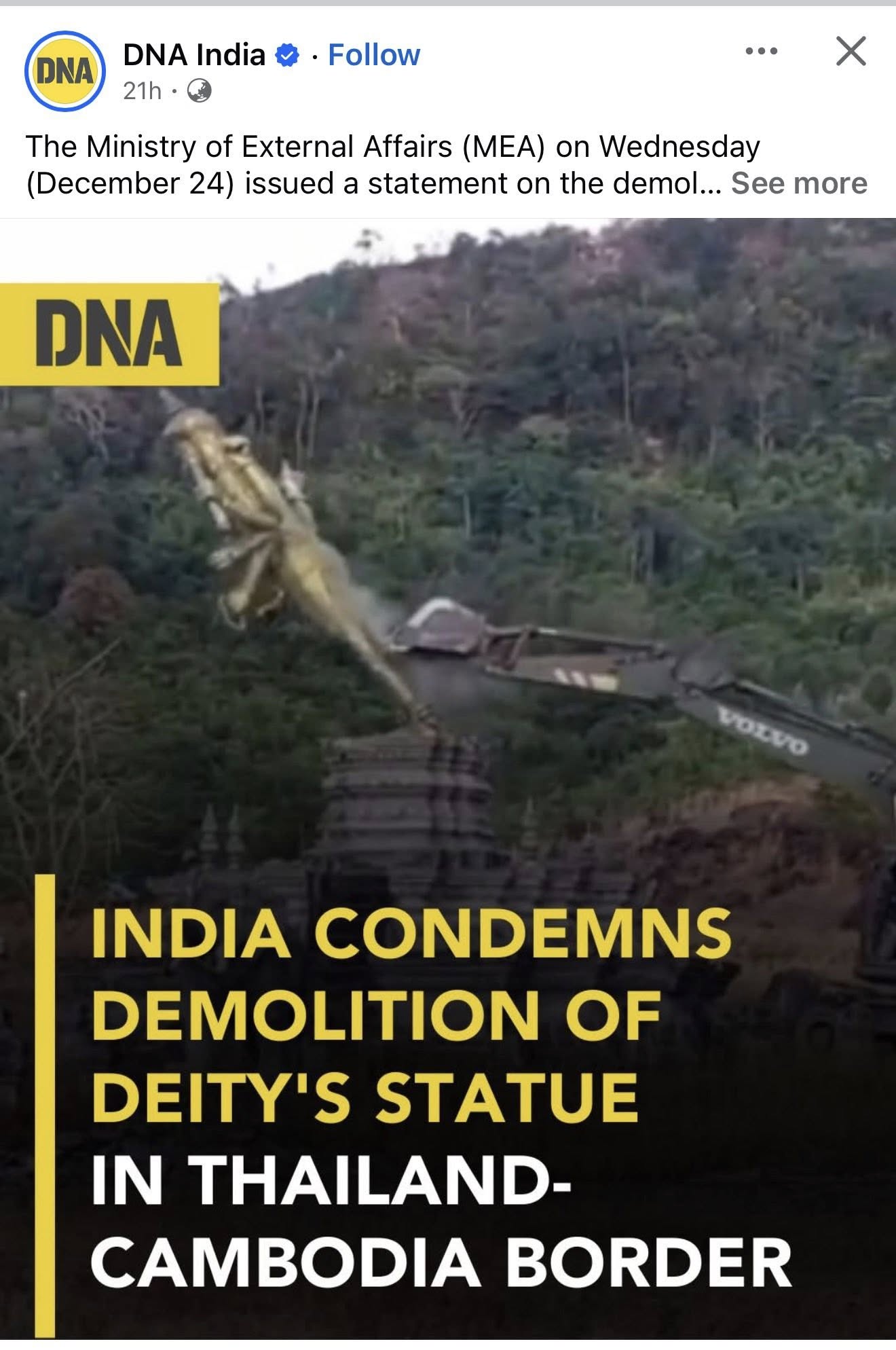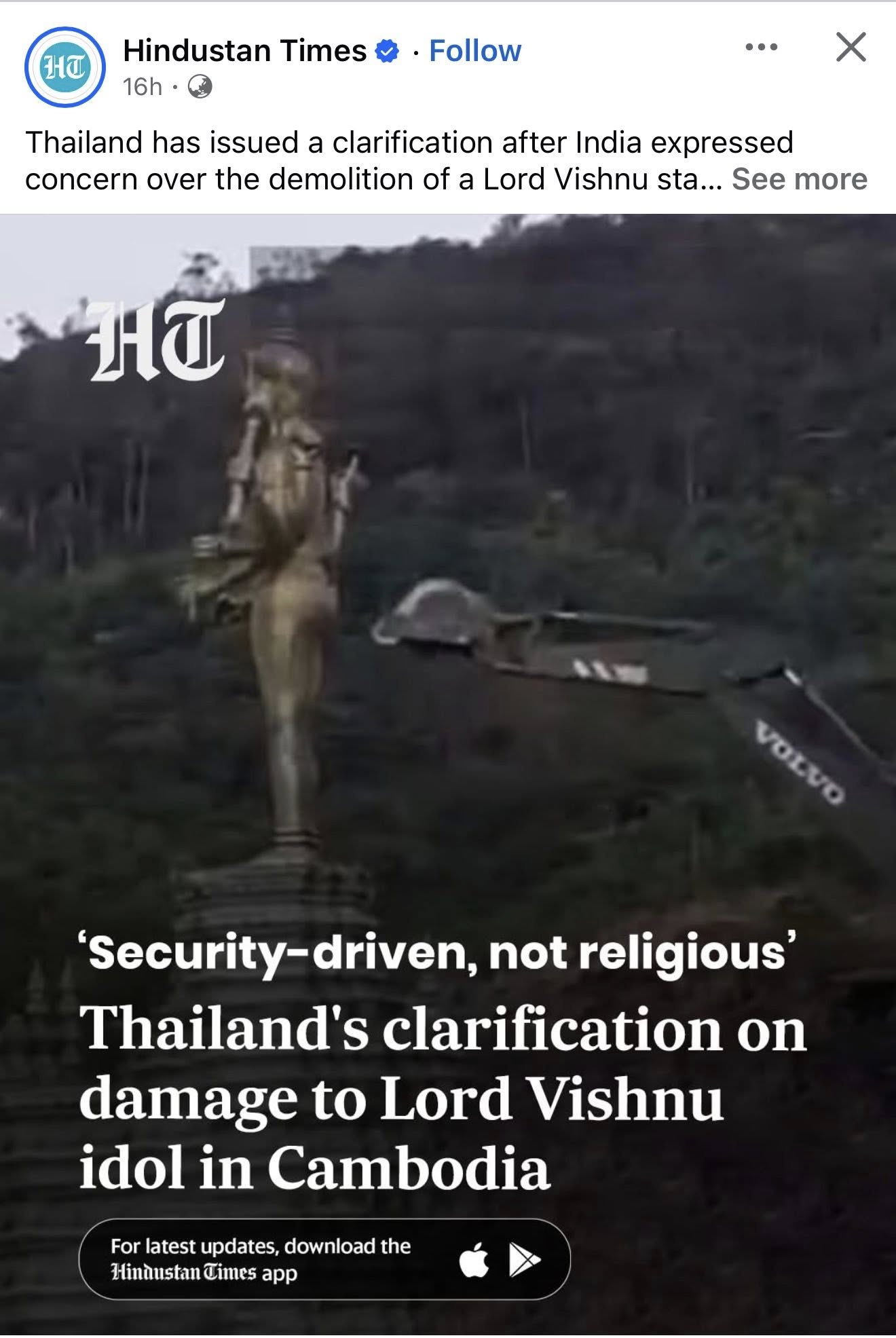 ជាក់ស្តែង លោក នេត្រ ភក្ត្រា រដ្ឋមន្ត្រីក្រសួងព័ត៌មាន បានប្រកាសនាព្រឹកថ្ងៃទី២៦ ខែធ្នូ ឆ្នាំ២០២៥នេះថា ៖ ពិភពលោកទាំងមូល ជាពិសេសអ្នកកាន់សាសនាហិណ្ឌូ នៅលើពិភពលោក បានមើលឃើញពីភាព ឃោរឃៅយ.ង់ឃ្នងរបស់យោធាថៃ ដែលបានវា.យកម្ទេ.ចបំផ្លាញរូបសំណាកព្រះវិស្ណុ ដែលជាទេវៈបង្កើតលោក និងថែរក្សាលោក ពេលខ្លួនបានប្រើកម្លាំងទ័ពឈ្លានពានកម្ពុជា ។ កាសែតនានាលើពិភពលោកបានបន្តយកប្រធានបទនេះមកជជែក ៕