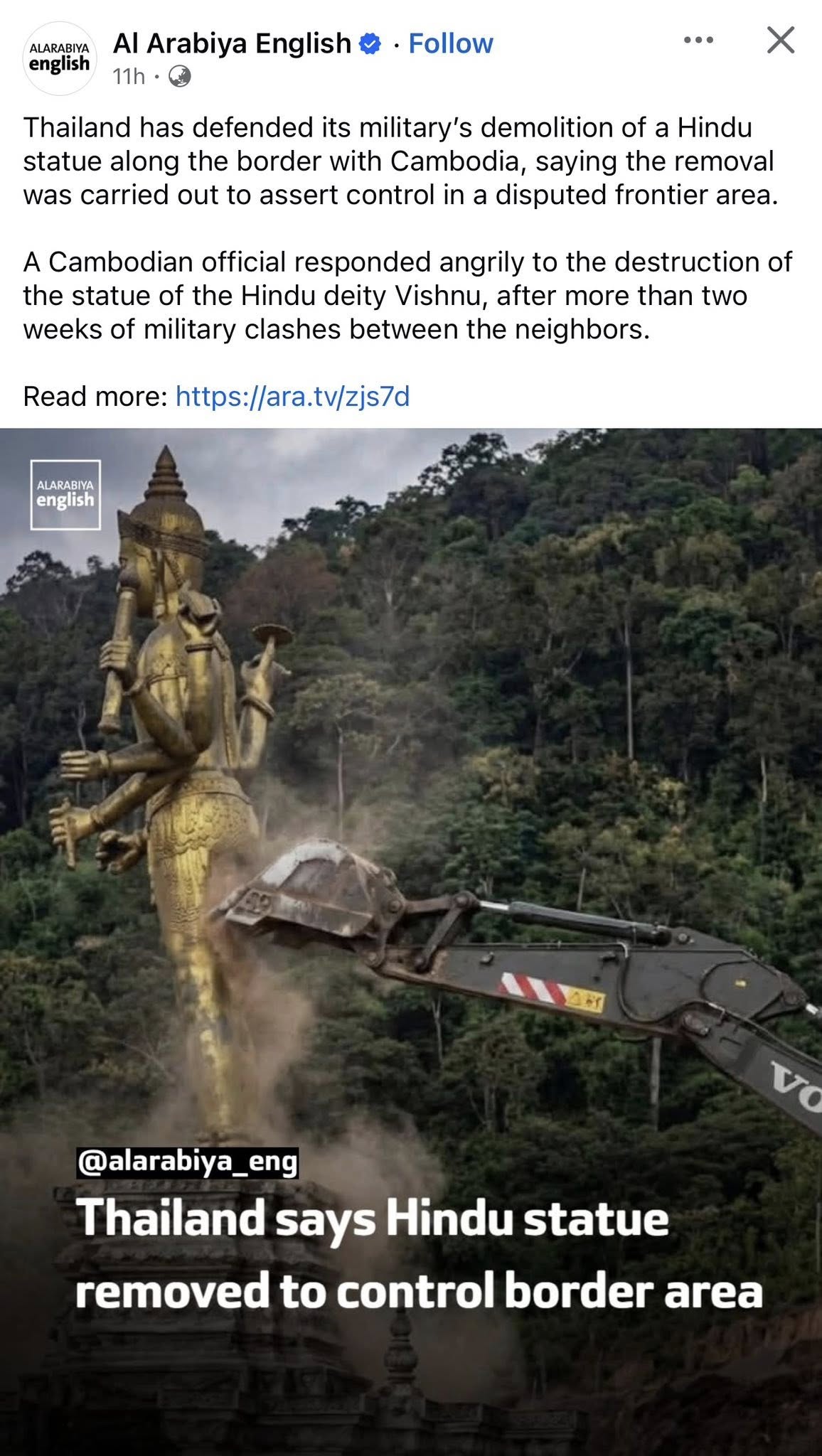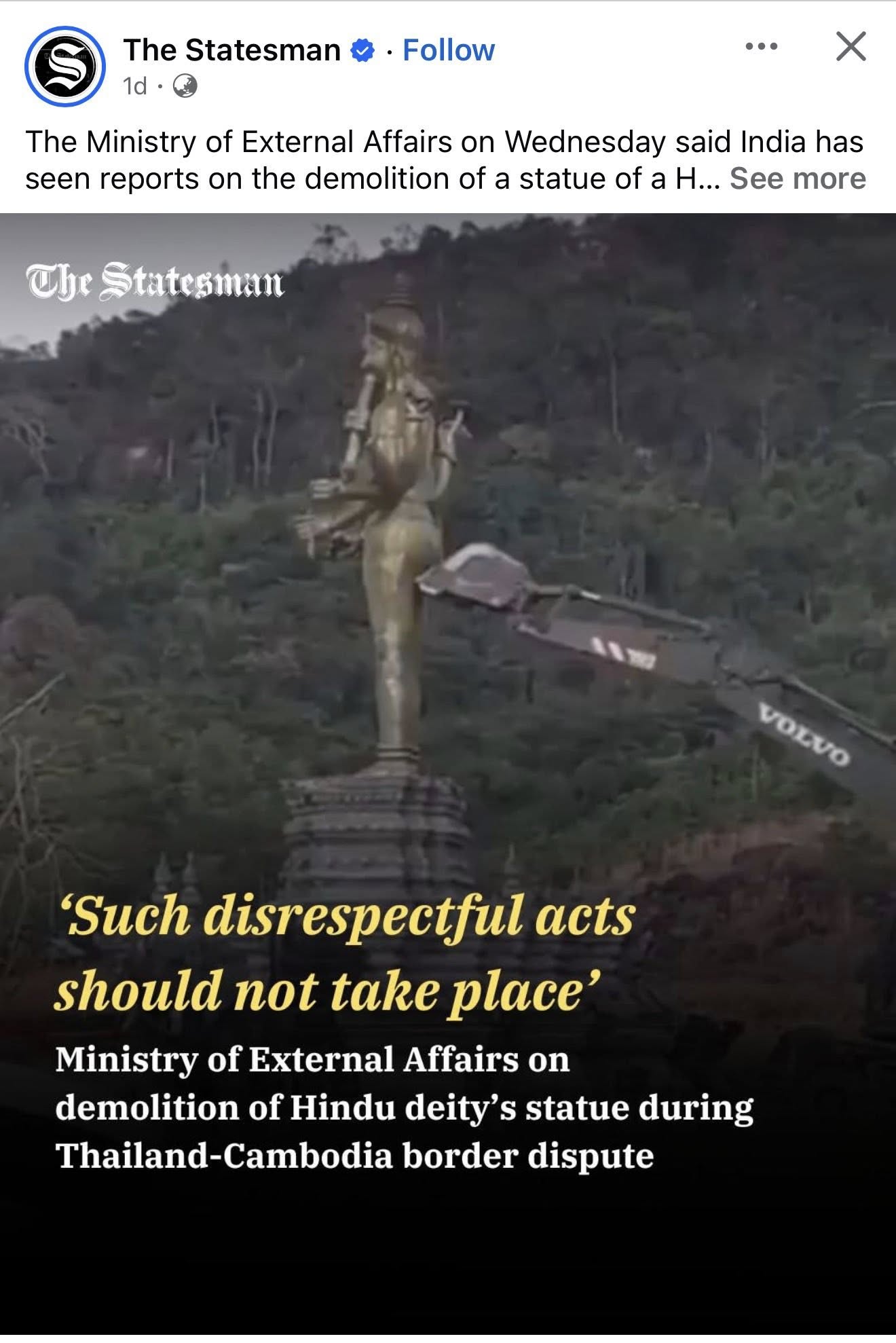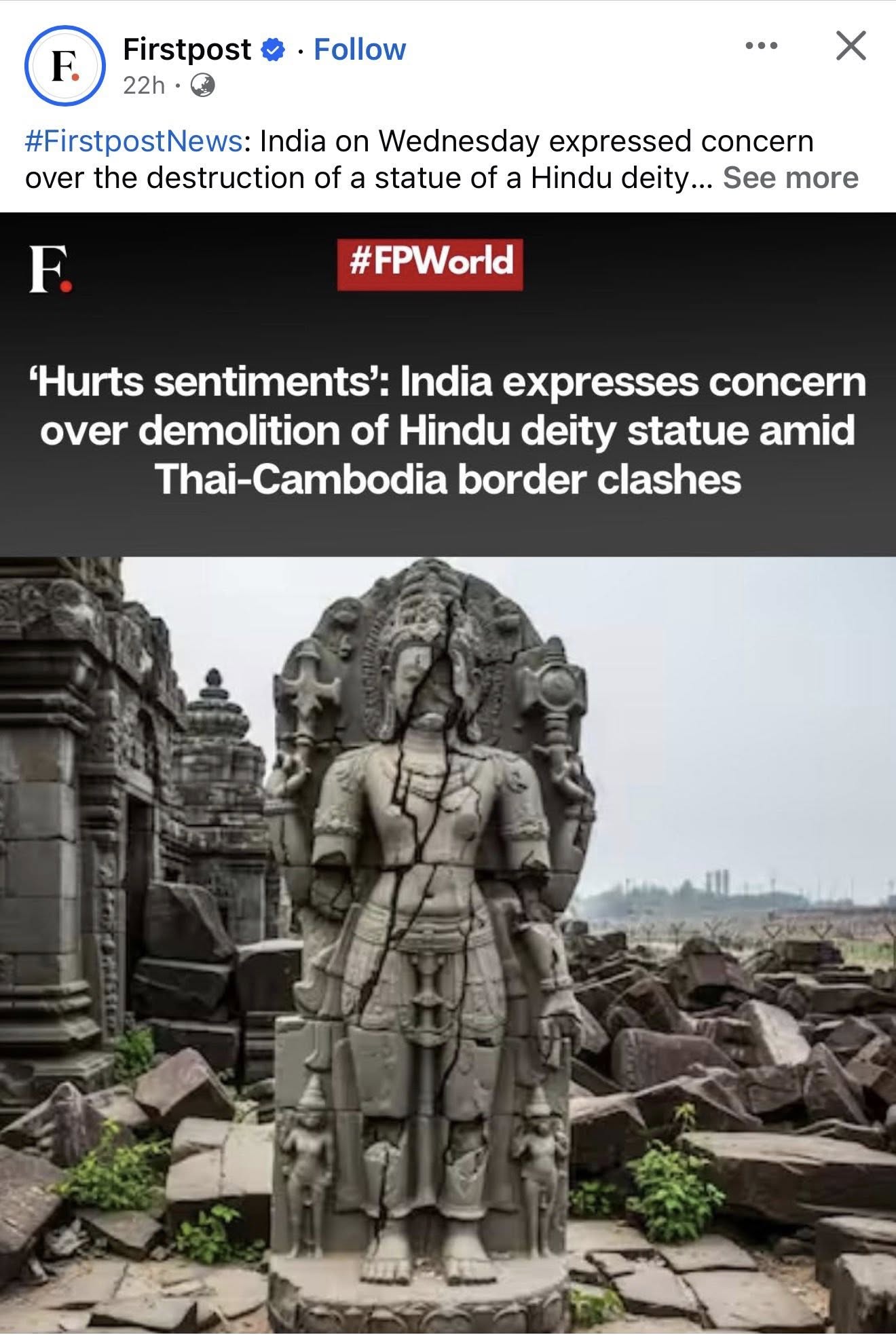 ជាក់ស្តែង លោក នេត្រ ភក្ត្រា រដ្ឋមន្ត្រីក្រសួងព័ត៌មាន បានប្រកាសនាព្រឹកថ្ងៃទី២៦ ខែធ្នូ ឆ្នាំ២០២៥នេះថា ៖ ពិភពលោកទាំងមូល ជាពិសេសអ្នកកាន់សាសនាហិណ្ឌូ នៅលើពិភពលោក បានមើលឃើញពីភាព ឃោរឃៅយ.ង់ឃ្នងរបស់យោធាថៃ ដែលបានវា.យកម្ទេ.ចបំផ្លាញរូបសំណាកព្រះវិស្ណុ ដែលជាទេវៈបង្កើតលោក និងថែរក្សាលោក ពេលខ្លួនបានប្រើកម្លាំងទ័ពឈ្លានពានកម្ពុជា ។ កាសែតនានាលើពិភពលោកបានបន្តយកប្រធានបទនេះមកជជែក ៕