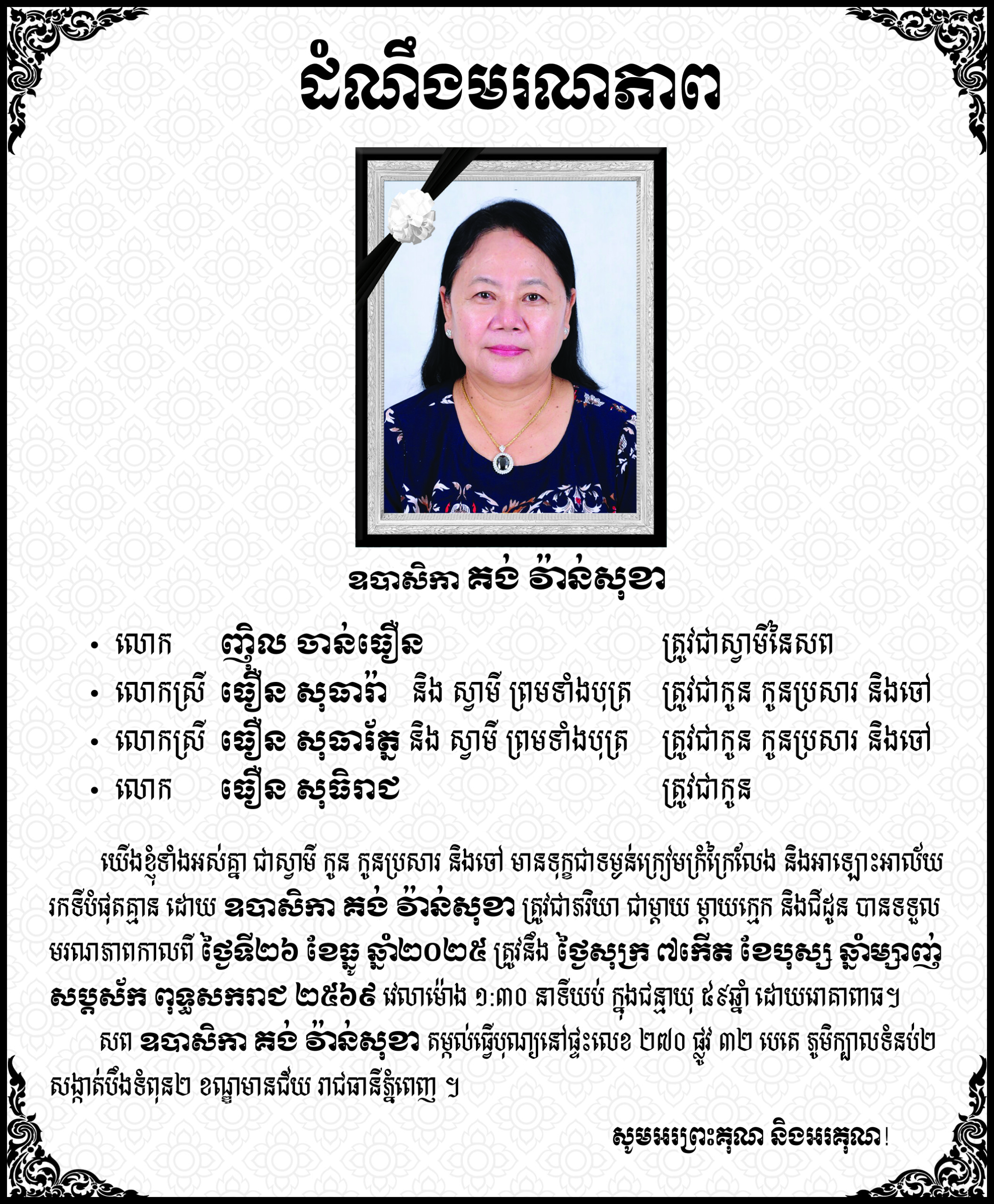 យើងខ្ញុំទាំងអស់គ្នា ជាស្វាមី កូន កូនប្រសារ និងចៅ មានទុក្ខជាទម្ងន់ក្រៀមក្រំក្រៃលែង និងអាឡោះអាល័យរកទីបំផុតគ្មាន ដោយឧបាសិកា គង់ វ៉ាន់សុខា ត្រូវជាភរិយា ជាម្ដាយម្ដាយក្មេក និងជីដូន បានទទួលមរណភាពកាលពីថ្ងៃទី២៦ ខែធ្នូ ឆ្នាំ២០២៥ ត្រូវនឹងថ្ងៃសុក្រ ៧កើត ខែបុស្ស ឆ្នាំម្សាញ់សប្តស័ក ពុទ្ធសករាជ ២៥៦៩ វេលាម៉ោង១:៣០នាទីយប់ ក្នុងជន្មាយុ៥៩ឆ្នាំ ដោយរោគា ពាធ។