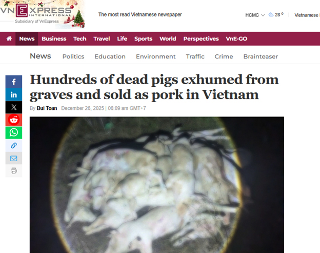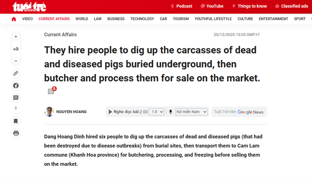 ប្រទេសវៀតណាម ៖ ប៉ូលិសប្រចាំខេត្ត ខាញ់ ហ័រ (Khanh Hoa) ភាគកណ្តាលប្រទេសវៀតណាម កាលពីថ្ងៃទី២៥ ខែធ្នូ ឆ្នាំ២០២៥ បានចោទប្រកាន់បុរសម្នាក់ និងមនុស្ស ៦ នាក់ផ្សេងទៀត ពីបទជីកយកជ្រូកងាប់ដោយសារឆ្លងជំងឺគ្រុនផ្តាសាយជ្រូកអាហ្វ្រិក ឬប៉េស្តជ្រូកអាហ្វ្រិករាប់រយក្បាល ដែលត្រូវបានកប់ចោល ដើម្បីយកមកកែច្នៃ និងបង្កក មុនពេលលក់នៅលើទីផ្សារ។ នេះបើតាមប្រភពពីសារព័ត៌មានវៀតណាម VnExpress និង Tuoi Tre បានចេញផ្សាយ។