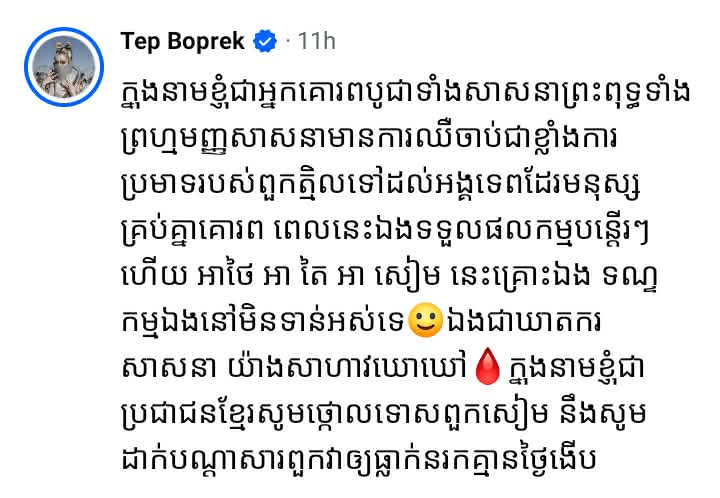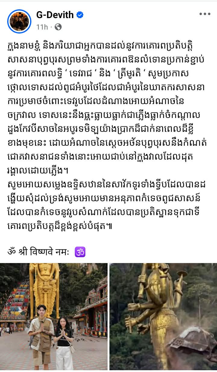 តាមរយៈសំណេរបង្ហោះលើបណ្តាញសង្គមតារាចម្រៀងលោក ជី ដេវីដ បានលើកឡើងថា ក្នុងនាមខ្ញុំ និងភរិយាជាអ្នកបានដល់នូវការគោរពប្រតិបតិ្តសាសនាបុព្វបុរស ព្រមទាំងការគោរពឱនលំទោនប្រកាន់ខ្ជាប់នូវការគោរពលទ្ធិ «ទេវរាជ» និង« ត្រីមូរតិ» សូមប្រកាសថ្កោលទោសដល់ពូជអំបូរថៃ ដែលជាអំបូរនៃឃាតករសាសនាការប្រមាថចំពោះទេវរូប ដែលតំណាងអោយអំណាចនៃចក្រវាឡ ។