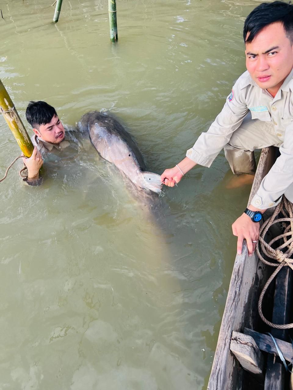 នេសាទបានត្រីរាជទម្ងន់ជិត១០០គីឡូ រួចរាយការណ៍ជូនមន្ត្រីជំនាញដើម្បីលែងចូលទន្លេវិញ
