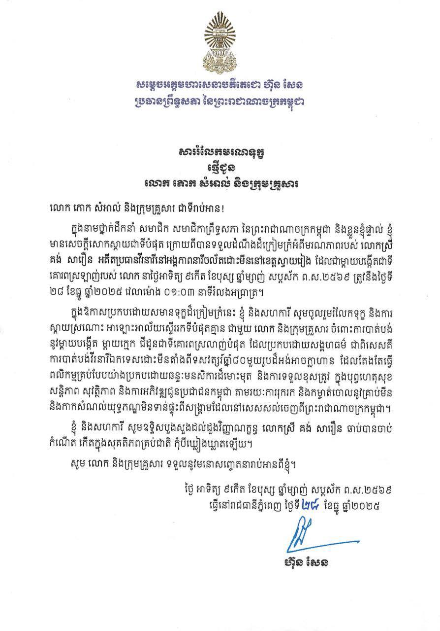 ខេត្តស្វាយរៀង ៖ នៅព្រឹកថ្ងៃទី២៨ ធ្នូ ឆ្នាំ២០២៥នេះ សម្តេចអគ្គមហាសេនាបតីតេជោ ហ៊ុន សែន ប្រធានព្រឹទ្ធសភានៃព្រះរាជាណាចក្រកម្ពុជា ផ្ញើសារលិខិតរំលែកទុក្ខជូនលោក ភោក សំអាល់ និងក្រុមគ្រួសារ ចំពោះមរណភាពលោកស្រី គង់ សារឿន អតីតប្រធានវីរនារីនៅអង្គភាពនារីចល័តដោះមីននៅខេត្តស្វាយរៀង ដែលបានទទួលមរណភាព ដោយរោគាពាធ។