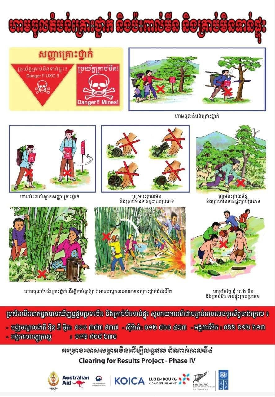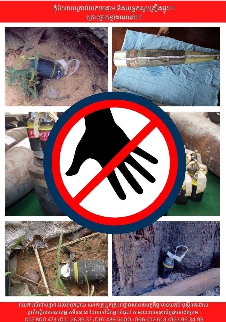អាជ្ញាធរមីនសូមអំពាវនាវ ៖ សូមកុំចូលតំបន់ណាដែលសង្ស័យបន្សល់គ្រាប់យុទ្ធភណ្ឌមិនទាន់ផ្ទុះសេសសល់ពីសង្គ្រាម និងមុនចូលតំបន់នោះត្រូវសាកសួរព័ត៍មានពីអាជ្ញាធរមានសមត្ថកិច្ច មេភូមិ មេឃុំ និងប៉ុស្តិ៍នគរបាល។