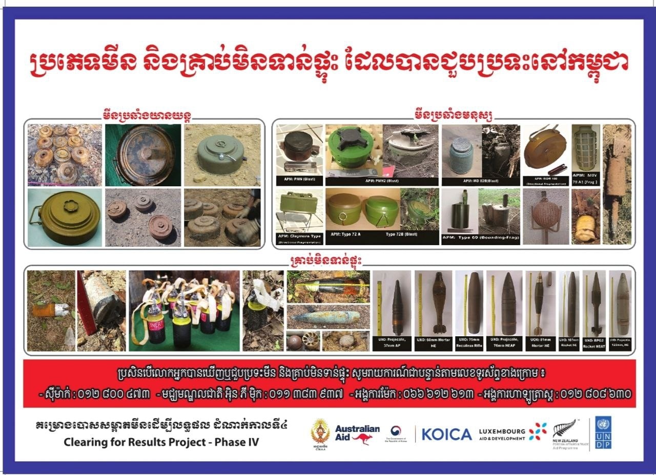 នៅពេលប្រទះឃើញមីន គ្រាប់មិនទាន់ផ្ទុះ គ្រាប់បែកចង្កោម និងវត្ថុចំលែកសង្ស័យជាគ្រាប់ សូមកុំប៉ះពាល់ កែច្នៃ គប់ ដុំ ឬចល័តទៅទីណាមួយ គ្រាប់ទាំងនោះនឹងធ្វើឱ្យរបួស ពិការ ស្លា.ប់ គ្រប់ពេល និងសូមរាយការណ៍ជាបន្ទាន់ ទៅអាជ្ញាធរមានសមត្ថកិច្ច ប៉ុស្តិ៍នគរបាល មេភូមិ មេឃុំ និងប្រតិបត្តិករបោសសម្អាតមីន តាមរយ:លេខទូរស័ព្ទ ដូចខាងក្រោម ៖ 012 800 473 – 011 38 39 37 – 097 489 5600 – 066 612 613 – 063 96 34 99 ៕