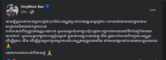 ខេត្តប៉ៃលិន ៖ លោកស្រី បាន ស្រីមុំ អភិបាលខេត្តប៉ៃលិន បានប្រកាសនារសៀលថ្ងៃទី៣០ ខែធ្នូ ឆ្នាំ២០២៥នេះថា ៖ នាងខ្ញុំ សូមគោរពជម្រាបជូនពុកម៉ែបងប្អូនប្រជាពលរដ្ឋមេត្តាជ្រាប មកដល់ម៉ោងនេះ ក្នុងនាមអាជ្ញាធរមិនទាន់ទទួលបាន ព័ត៍មានអំពីយុទ្ធជន ១៨រូបនោះទេ សូមមេត្តាកុំមកជួបជុំបង្កជាបញ្ហាចលាចលនៅទីតាំងព្រំដែនជាដាច់ខាត សូមមេត្តារក្សាភាពស្ងៀមស្ងាត់ ក្នុងនាមរដ្ឋបាលខេត្ត និងផ្តល់ព័ត៍មានពិតជូនបងប្អូនដើម្បីជ្រាប និងដើម្បីចូលរួមទទួលស្វាគមន៍បងប្អូនយុទ្ធជនយើង ទាំងអស់គ្នានៅពេលវេលាច្បាស់លាស់ ដោយការគោរពអំពីនាងខ្ញុំ ៕