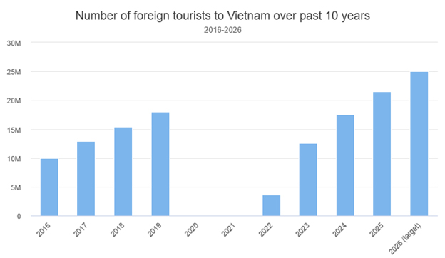 ទីក្រុងហាណូយ ៖ ជាមួយការមកដល់របស់ភ្ញៀវទេសចរអន្តរជាតិជាង ២១ លាននាក់ ដែលជាចំនួនខ្ពស់បំផុតមិនធ្លាប់មានពីមុននៅក្នុងប្រទេសវៀតណាមនោះ ឆ្នាំ ២០២៥ ត្រូវបានកំណត់ជាឆ្នាំមាស និងបើកសម័យកាលថ្មីមួយសម្រាប់ឧស្សាហកម្មទេសចរណ៍របស់ប្រទេសនៅអាស៊ីអាគ្នេយ៍មួយនេះ។