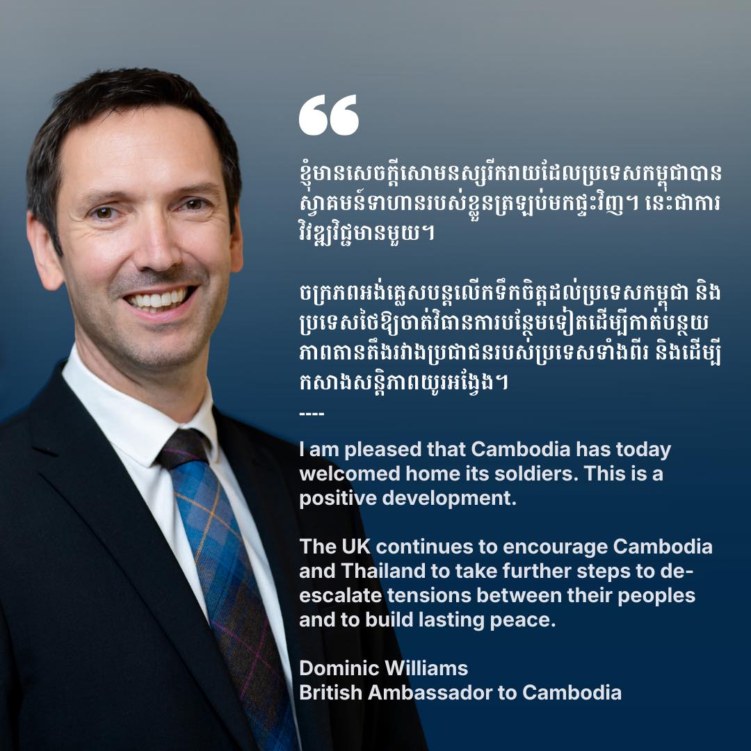 រាជធានីភ្នំពេញ ៖ លោក Dominic Williams ឯកអគ្គរាជទូតចក្រភពអង់គ្លេសប្រចាំកម្ពុជា បានប្រកាសនាថ្ងៃទី៣១ ខែធ្នូ ឆ្នាំ២០២៥ ថា ៖ «ខ្ញុំមានសេចក្តីសោមនស្សរីករាយដែលប្រទេសកម្ពុជាបានស្វាគមន៍ទាហានរបស់ខ្លួនត្រឡប់មកផ្ទះវិញ ។ នេះជាការវិវឌ្ឍនវិជ្ជមានមួយ»។