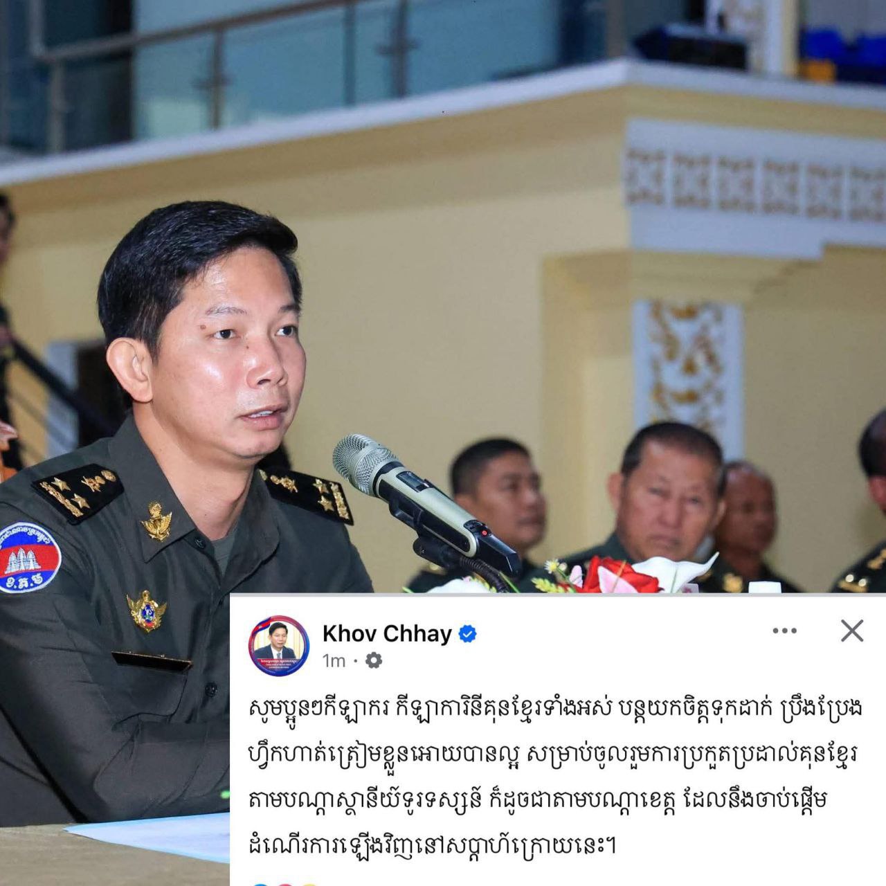 ឆាយ ប្រធានសហព័ន្ធកីឡាប្រដាល់គុនខ្មែរបានសរសេរសារបង្ហោះថា«សូមប្អូនៗកីឡាករ កីឡាការិនីគុនខ្មែទាំងអស់បន្តយកចិត្តទុកដាក់ប្រឹងប្រែងហ្វឹកហាត់ត្រៀមខ្លួនឱ្យបានល្អ សម្រាប់ចូលរួមការប្រកួតប្រដាល់គុនខ្មែរតាមស្ថានីយទូរទស្សន៍ ក៏ដូចជាតាមបណ្ដាខេត្តដែលនឹងចាប់ផ្ដើមដំណើរការឡើងវិញនៅសប្ដាហ៍ក្រោយនេះ»។
