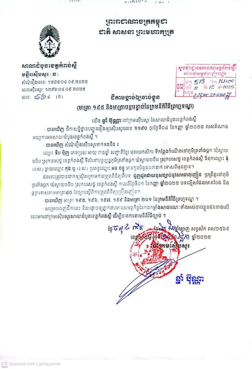 នគរបាលស្រុកបសេដ្ឋបានបញ្ជាក់ថា មុខសញ្ញាចែកចាយនិងជួញដូរគ្រឿងញៀនឈ្មោះ ឌឹប មុិញ ខាងលើនេះមានទាំងដីការ បង្គាប់ឲ្យចាប់ខ្លួនលេខ ៨២០ របស់លោក ធ្ធាំ ប៊ុណ្ណា ចៅក្រមសើបសួរនៃសាលាដំបូងខេត្តកំពង់ស្ពឺ ពីបទជួញដូរដោយខុសច្បាប់នូវសារធាតុញៀនប្រព្រឹត្តនៅភូមិត្រពាំងធ្លក ឃុំស្វាយចចិប ស្រុកបសេដ្ឋខេត្តកំពង់ស្ពឺកាលពីថ្ងៃ០១ខែកញ្ញា ឆ្នាំ២០២៥ ថែមទៀតផង។