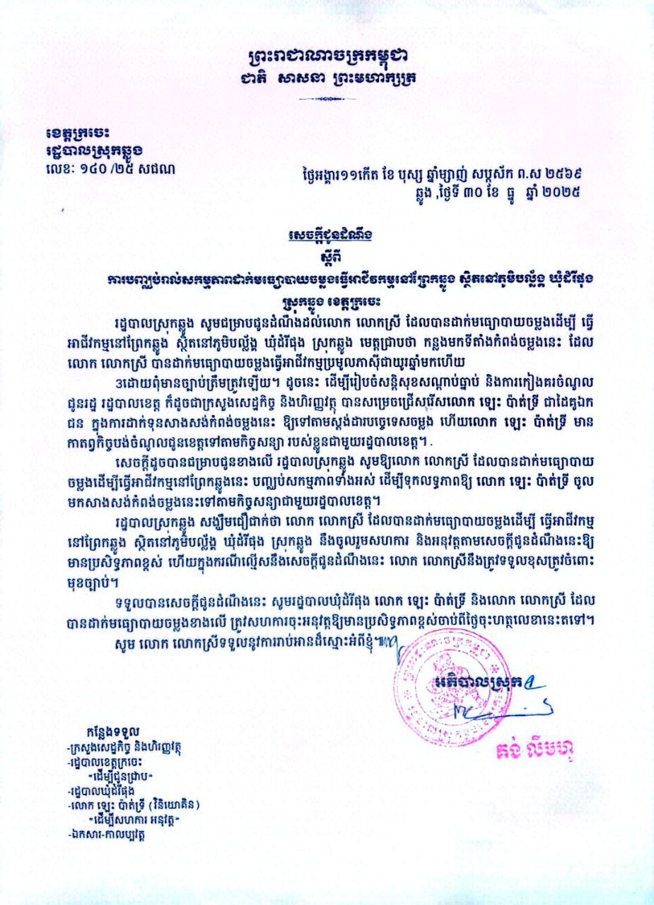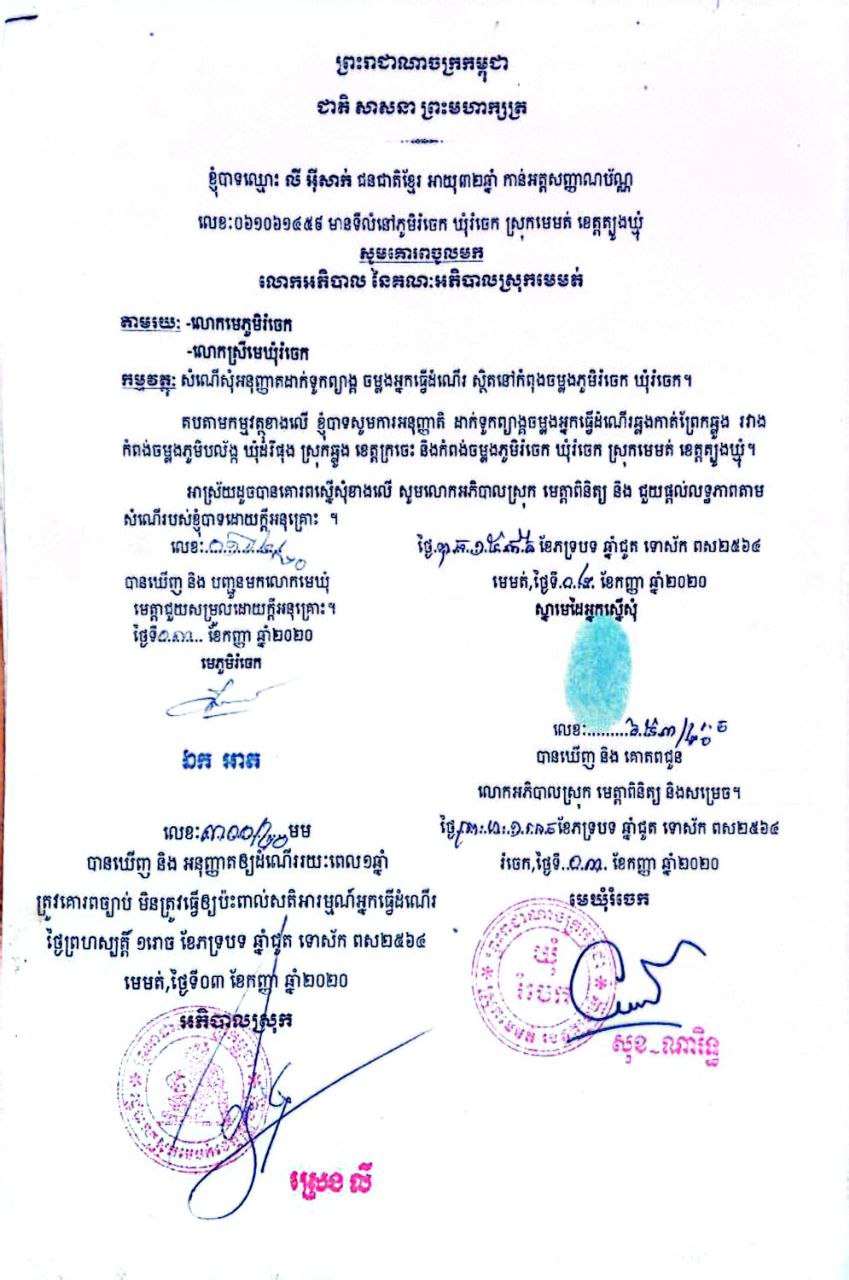 ឈ្មោះអ៊ីសាក់ បានរៀបរាប់ឲ្យដឹងទៀតថា ដោយសារតែមានការព្រួយបារម្ភខ្លាចគេថាអញ្ចេះថាអញ្ចុះទើបធ្វើលិខិតមួយច្បាប់មកលោកស្រេង លី អភិបាលស្រុកមេមត់ ចុះថ្ងៃទី៣ខែកញ្ញា ឆ្នាំ២០២៥ ដោយបានអនុញ្ញាតឱ្យរូបគេដាក់ទូកចម្លងអ្នកធ្វើដំណើរឆ្លងកាត់ព្រែកឆ្លូង រវាងកំពុងចម្លងភូមិបល្ល័ង្គ ឃុំដំរីផុង ស្រុកឆ្លង ខេត្តក្រចេះនិងកំពង់ចម្លងភូមិរំចេកឃុំរំចេក ស្រុកមេមត់ ខេត្តត្បូងឃ្មុំ តាមពាក្យសុំ។