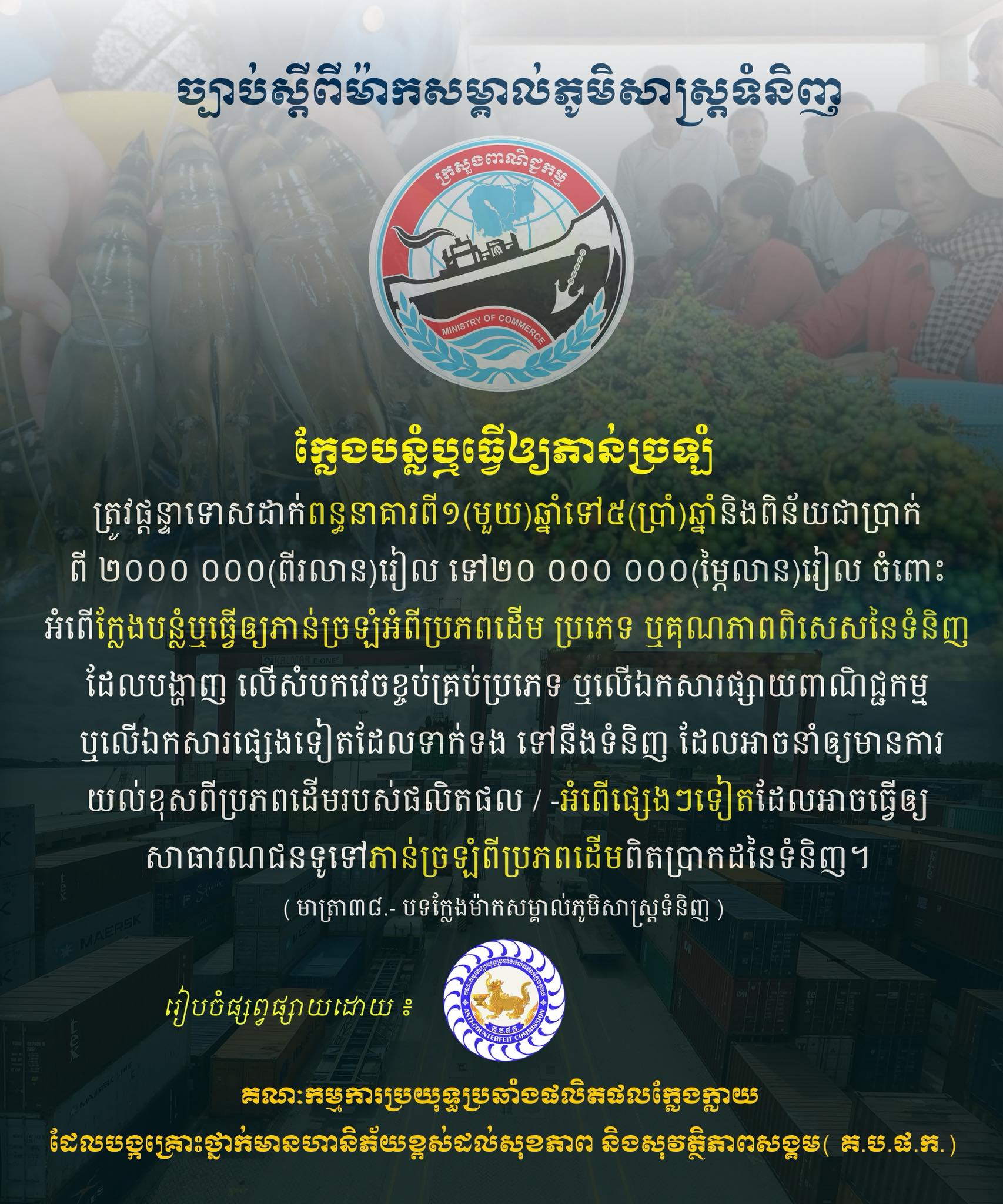 ជាក់ស្តែង គណៈកម្មាធិការប្រយុទ្ធប្រឆាំងផលិតផលក្លែងក្លាយ បានប្រកាសនាព្រឹកថ្ងៃទី០៥ ខែមករា ឆ្នាំ២០២៦នេះថា ៖ ក្លែងបន្លំ ឬធ្វើឲ្យភាន់ច្រឡំអំពីប្រភពដើម ប្រភេទ ឬគុណភាពពិសេសនៃទំនិញ ត្រូវផ្ដន្ទាទោសដាក់ពន្ធនាគារពី១ (មួយ) ឆ្នាំទៅ៥(ប្រាំ)ឆ្នាំ និងពិន័យជាប្រាក់ពី ២០០០ ០០០(ពីរលាន)រៀល ទៅ២០០០០ ០០០(ម្ភៃលាន)រៀល ។