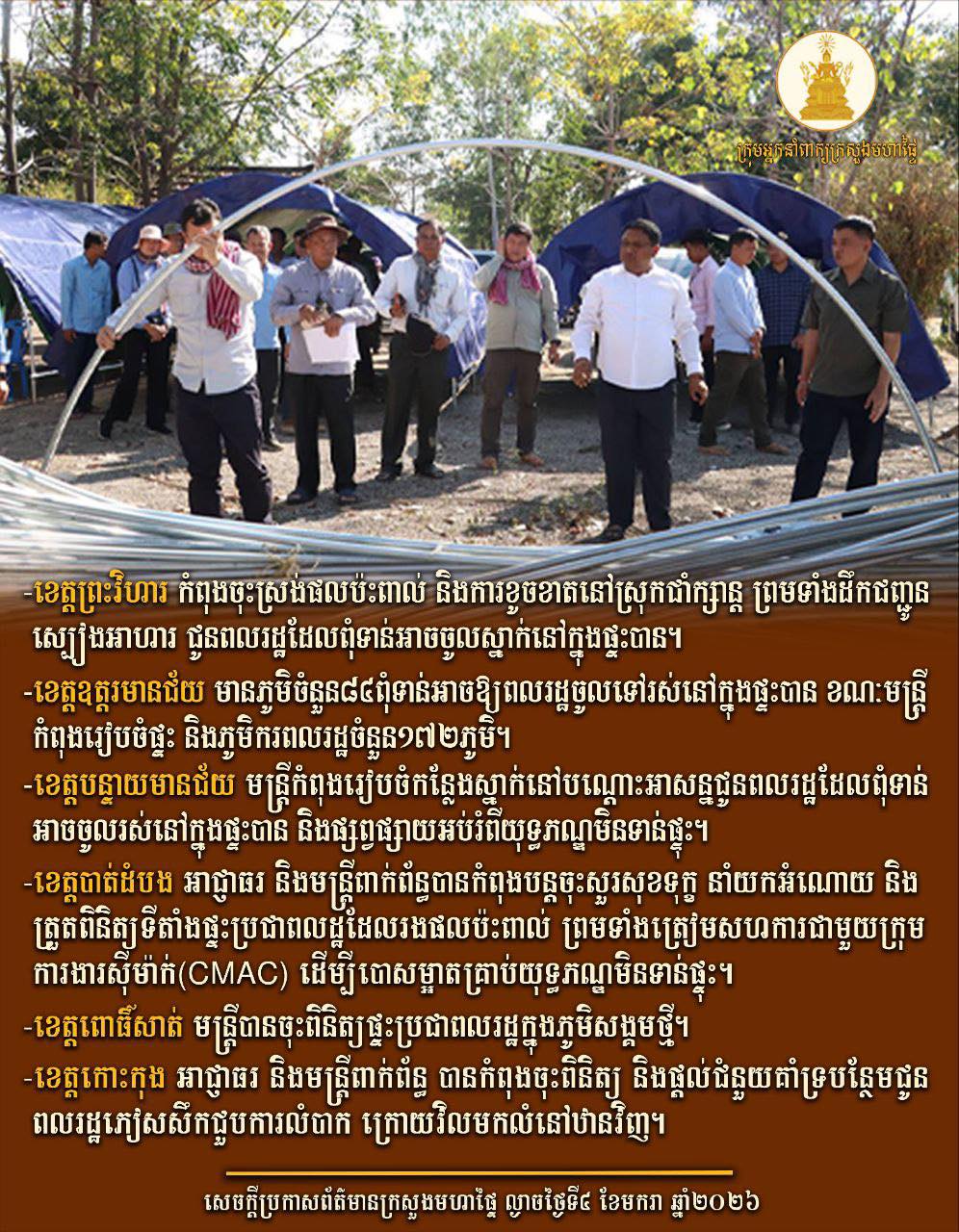 ជាក់ស្តែងក្រសួងមហាផ្ទៃ បានប្រកាសនៅលើបណ្តាញសង្គម នាថ្ងៃទី០៥ ខែមករា ឆ្នាំ២០២៦នេះថា ៖ ក្រសួងមហាផ្ទៃបានចេញសេចក្ដីប្រកាសព័ត៌មាន ល្ងាចថ្ងៃទី៤ ខែមករា ឆ្នាំ២០២៦ តាមរបាយការណ៍បានឱ្យដឹងថា ៖