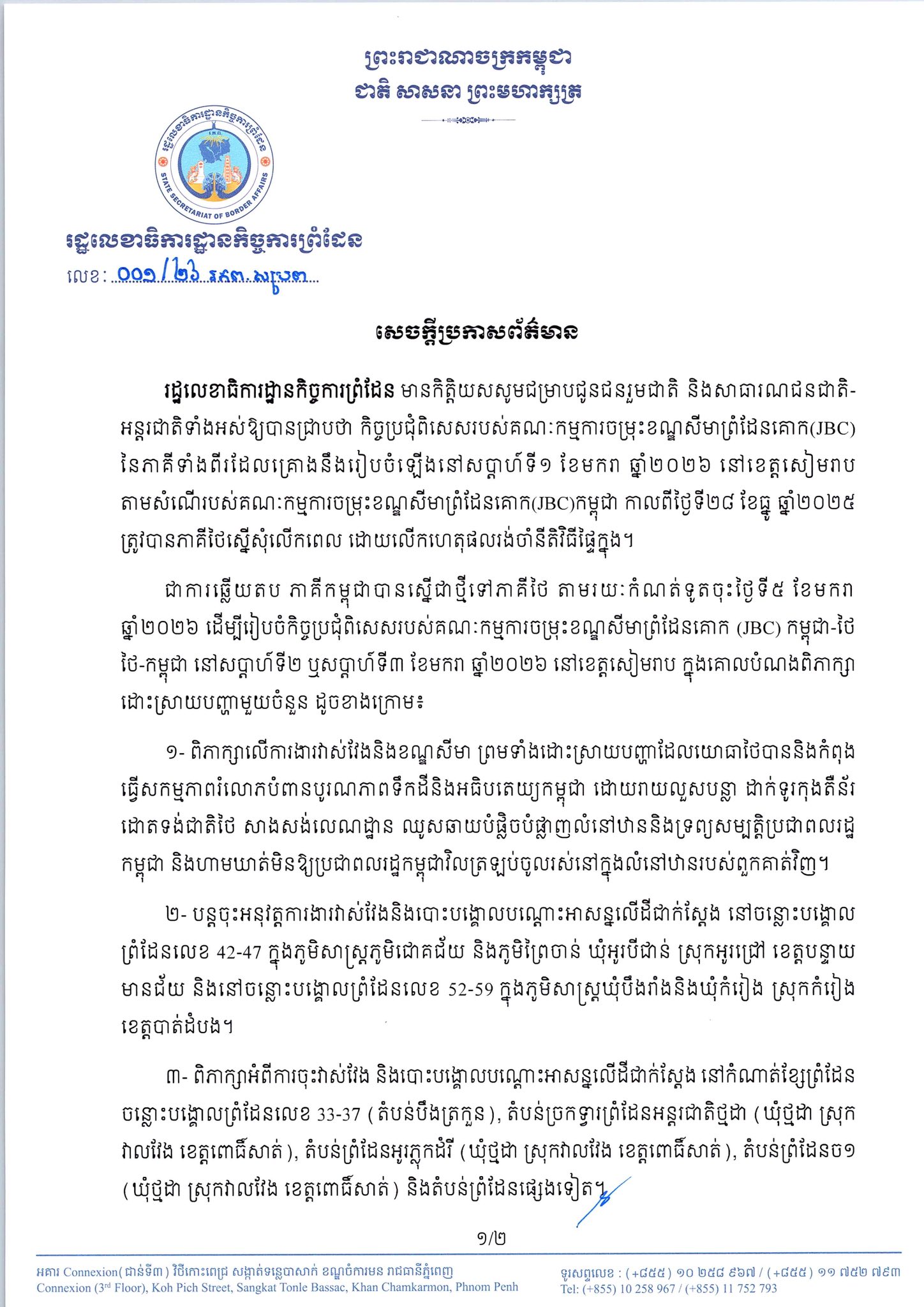 រាជធានីភ្នំពេញ ៖ រដ្ឋលេខាធិការដ្ឋានកិច្ចការព្រំដែន ចេញសេចក្តីប្រកាសព័ត៌មាននៅថ្ងៃទី៥ ខែមករា ឆ្នាំ២០២៦ ឱ្យដឹងថា កិច្ចប្រជុំពិសេសរបស់គណៈកម្មការចម្រុះខណ្ឌសីមាព្រំដែនគោក (JBC) នៃភាគីទាំងពីរ ដែលគ្រោងនឹងរៀបចំឡើង នៅសប្ដាហ៍ទី១ ខែមករា ឆ្នាំ២០២៦ នៅខេត្តសៀមរាប តាមសំណើរបស់គណៈកម្មការចម្រុះខណ្ឌសីមាព្រំដែនគោក (JBC) កម្ពុជា កាលពីថ្ងៃទី២៨ ខែធ្នូ ឆ្នាំ២០២៥ ត្រូវបានភាគីថៃ ស្នើសុំលើកពេល ដោយលើកហេតុផល រង់ចាំនីតិវិធីផ្ទៃក្នុង ។
